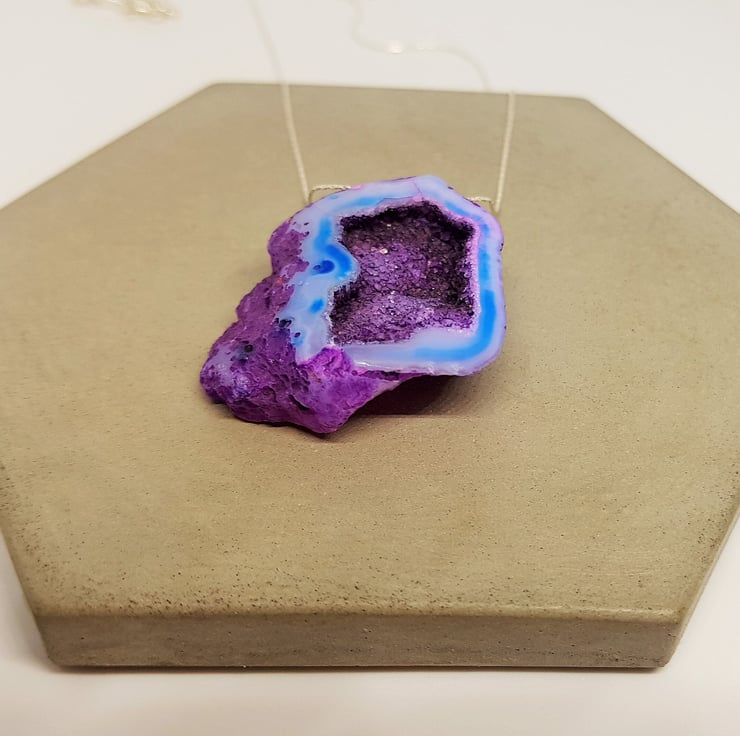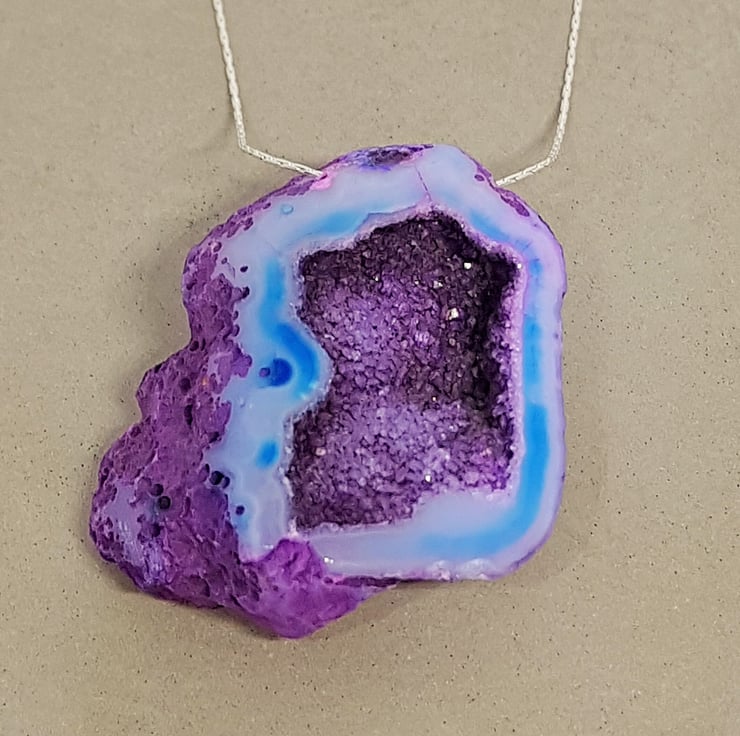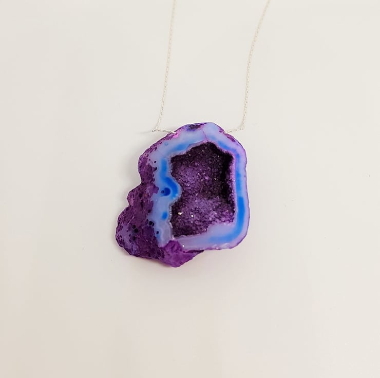 A beautiful purple Druzy cavern has been threaded on to sterling silver beading wire to form this necklace. The colours are stunning, and it has so much sparkle.