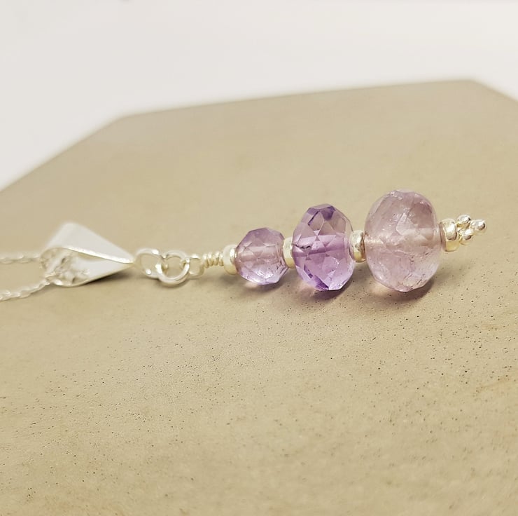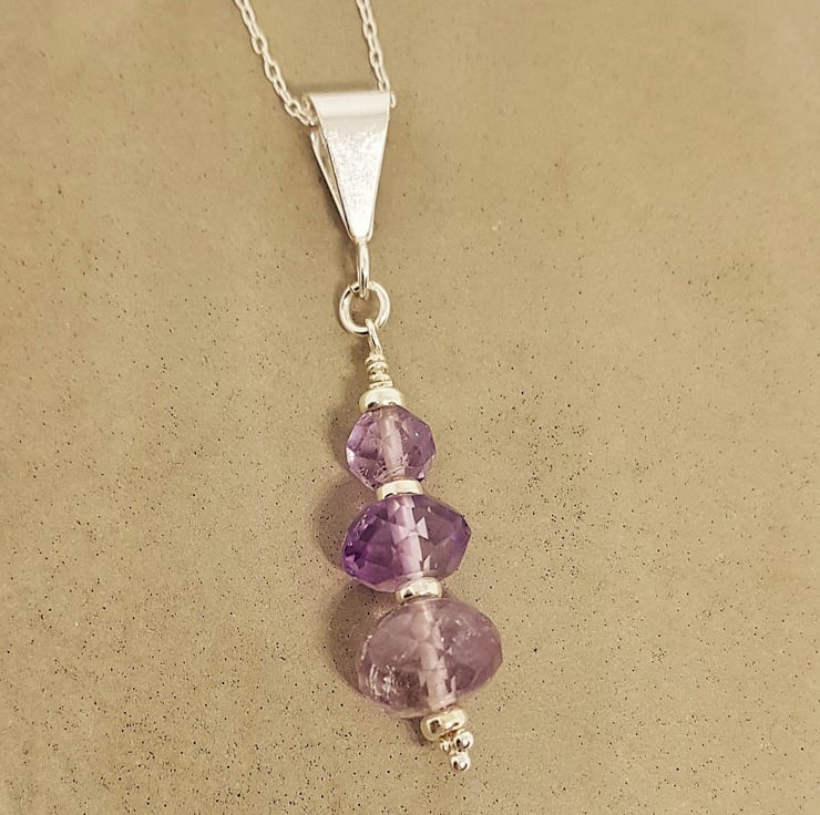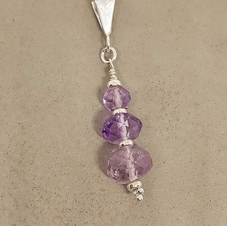 Three graduating sizes of faceted amethysts on sterling silver findings, this is a beautiful, simple piece that could be worn day or night. It also has a tiny sterling silver daisy at the base