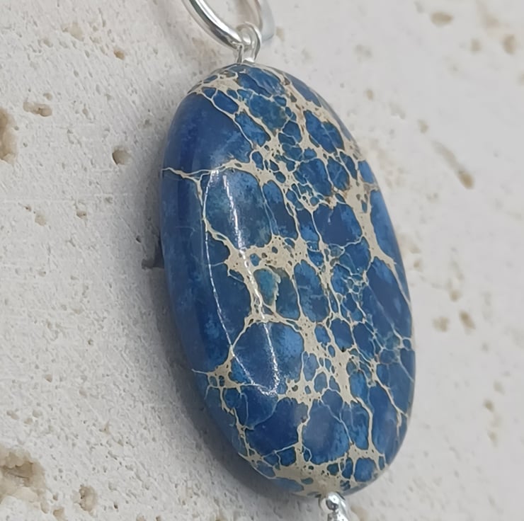 These blue Impression Jasper oval pendants are finished with sterling silver findings, and they are gorgeous!