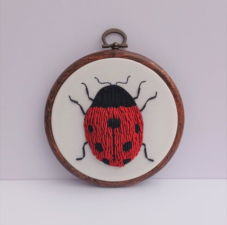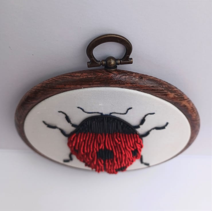 This ladybird design has been built up with padding to create a more 3D effect. is stitched on to a gorgeous white silk backing, and is framed in a 5 inch hoop. The hoop is backed with felt to protect the embroidery, and your wall!