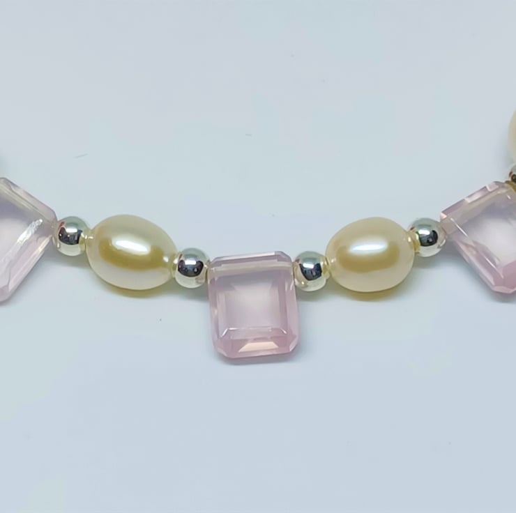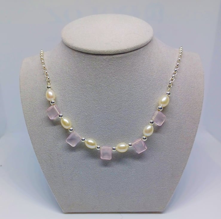 This beautiful necklace is created using amazing faceted Rose Quartz rectangles, surrounded by white oval pearls, and sterling silver beads. It is finished with sterling silver rolo chain, and fastens with a lobster claw clasp.