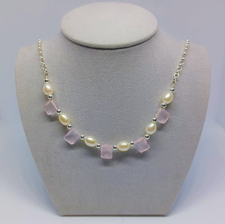 Rose Quartz and White Pearl Sterling Silver Necklace, Bride Jewellery, Bridesmaid Gift, Faceted Rose Quartz Necklace, Pearl Necklace