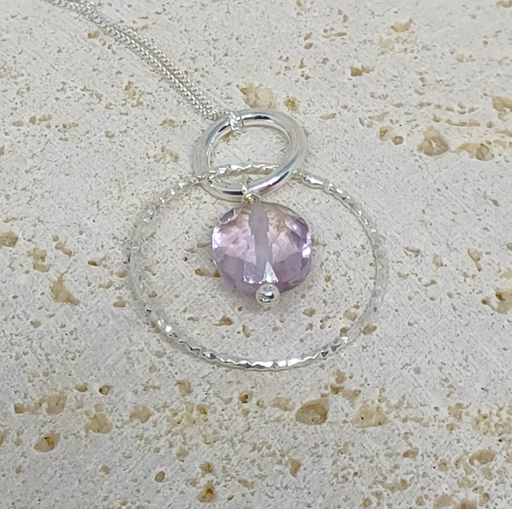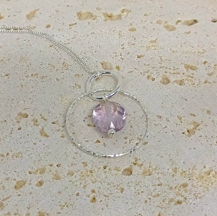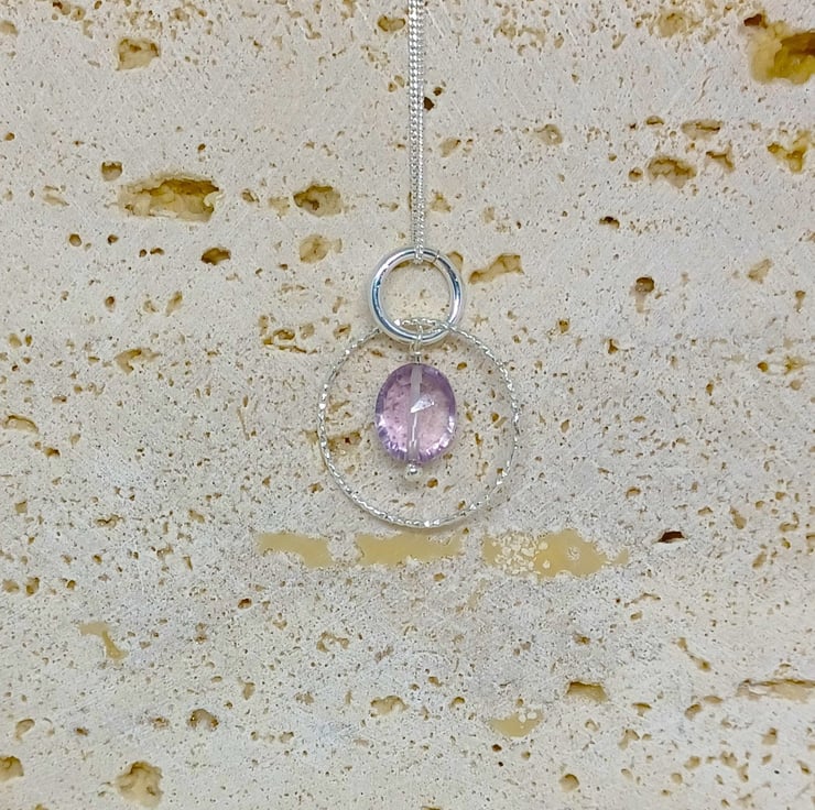 This beautiful gemstone pendant is completely hand made using sterling silver findings. It features a pink amethyst lozenge which measures approximately 10mm, suspended within a sparkling twisted silver hoop. It is supplied on an 18 inch sterling silver chain (style may vary)