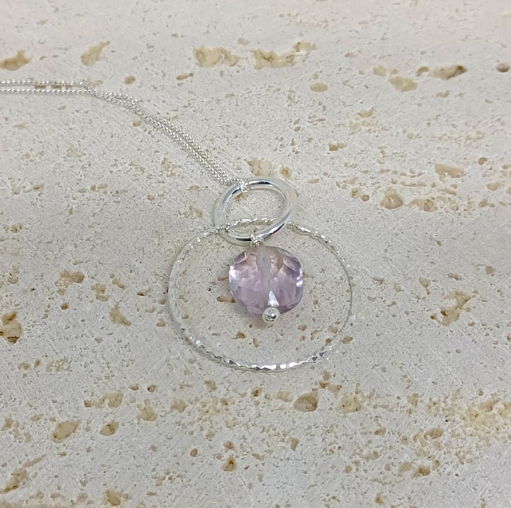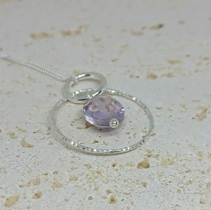 Pink Amethyst and Sterling Silver Sparkly Ring Gemstone Necklace, Pink Amethyst Pendant, Silver Hoop Pendant, Sparkly Hoop,