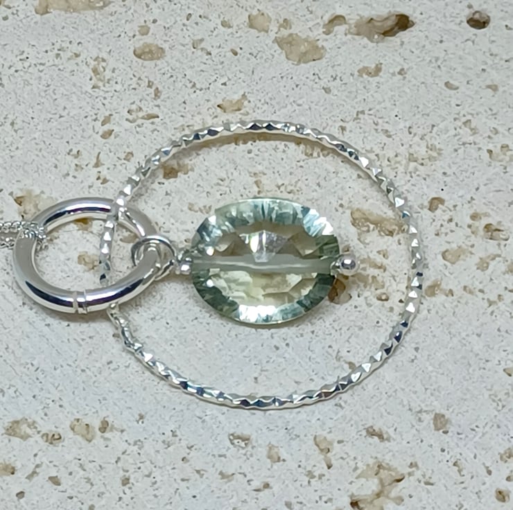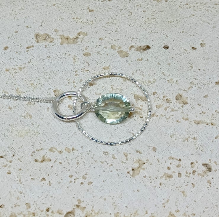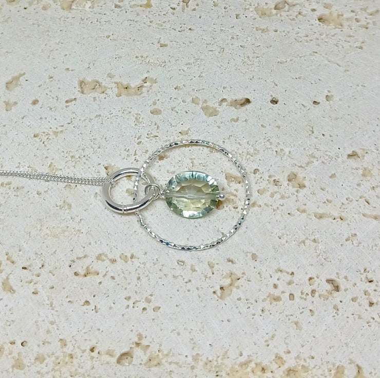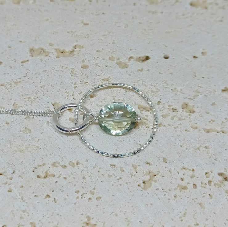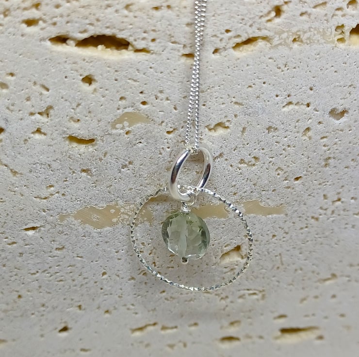Green Amethyst and Sterling Silver Sparkly Ring Gemstone Necklace, Green Amethyst Pendant, Silver Hoop Pendant, Sparkly Hoop, Prasiolite Gem