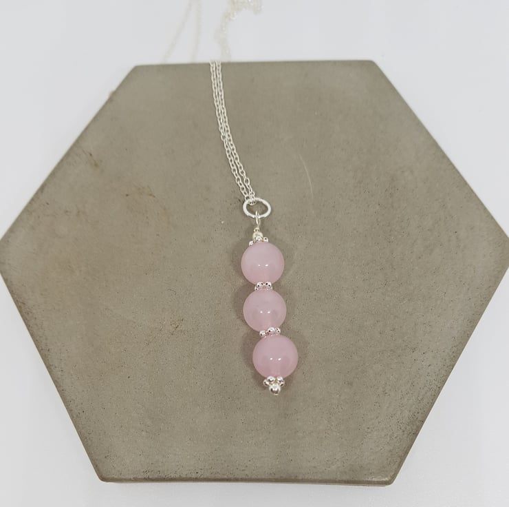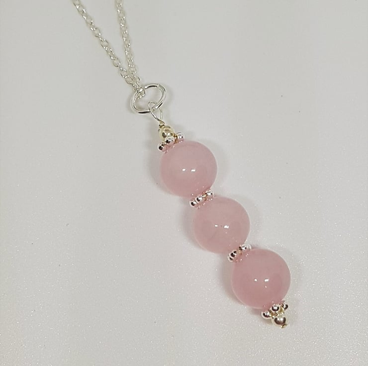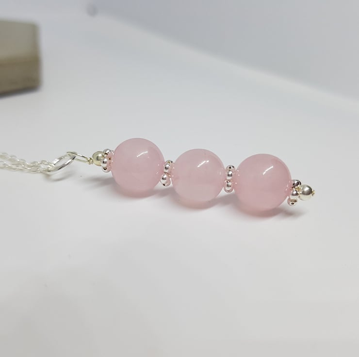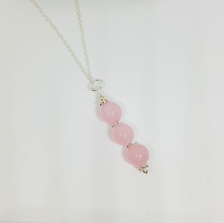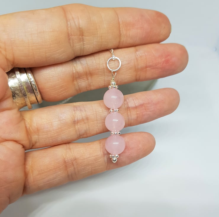 This trio of 8mm Rose Quartz gemstones is interspersed with little sterling silver flower beads, which set them off beautifully.
