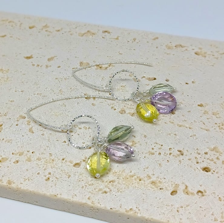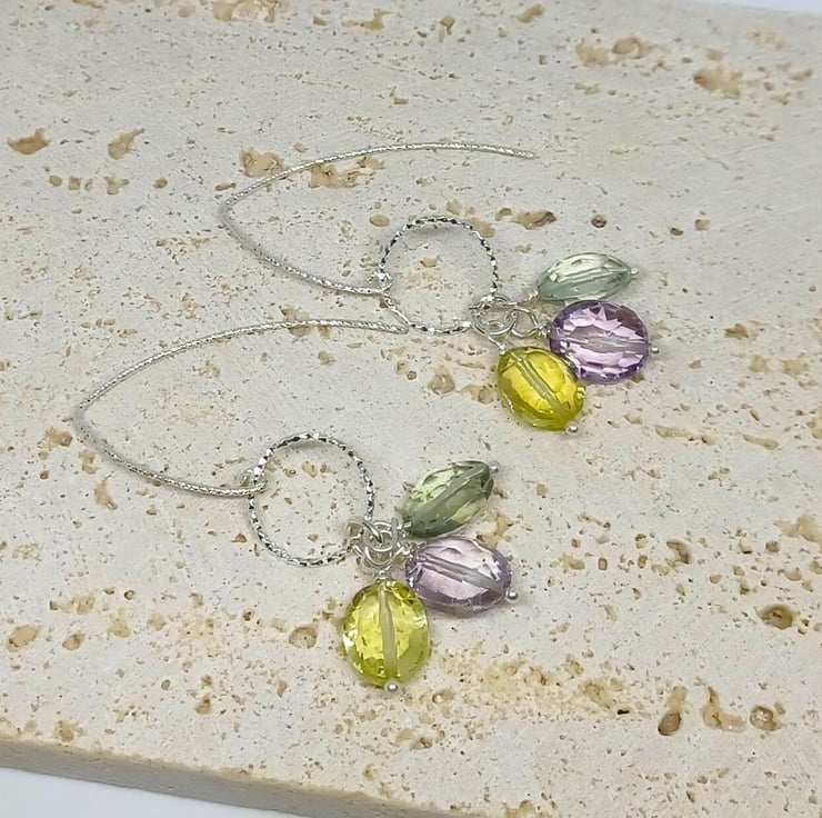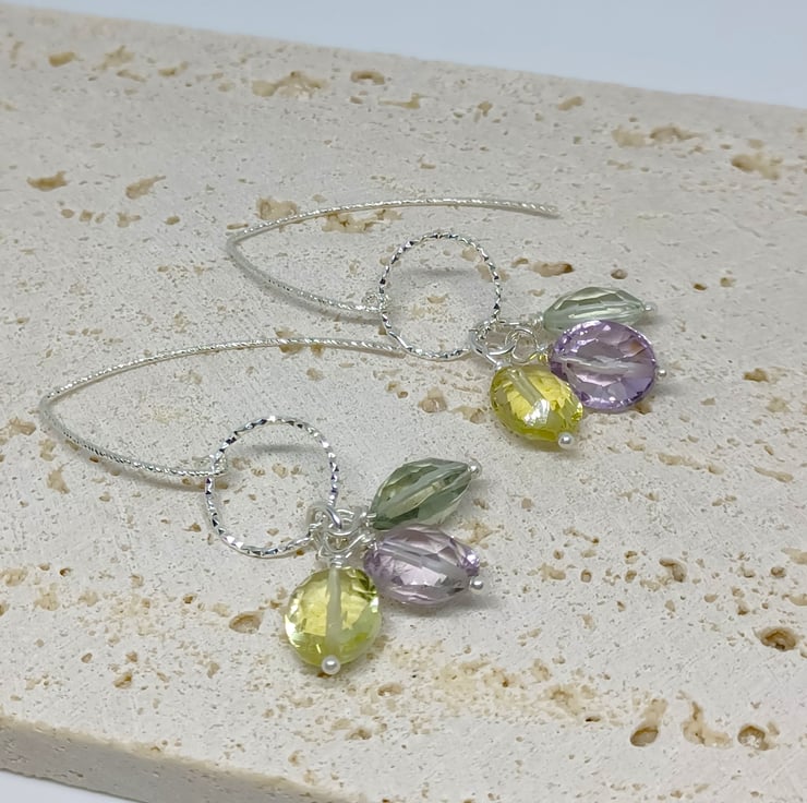These lovely earrings feature beautiful faceted gemstones of pink amethyst, green amethyst and lemon quartz. They are accented with sparking sterling silver. The gemstone lozenges measure approx. 1cm each