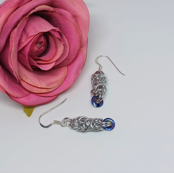Silver Byzantine Chainmaille Sterling Silver Earrings with Blue Czech Glass Donut Rings