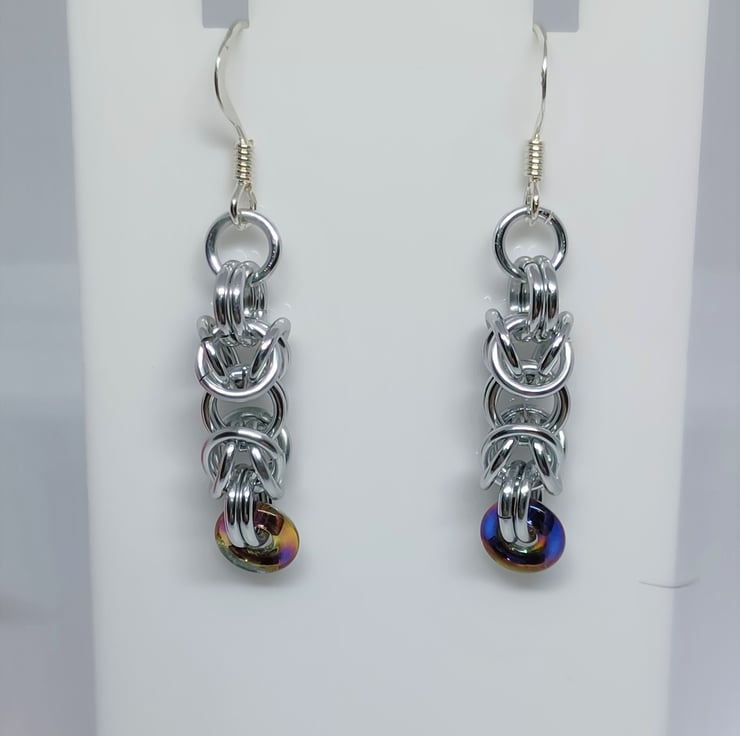 These fabulous earrings feature silver coloured Byzantine weave, with a blue Czech glass donut ring.