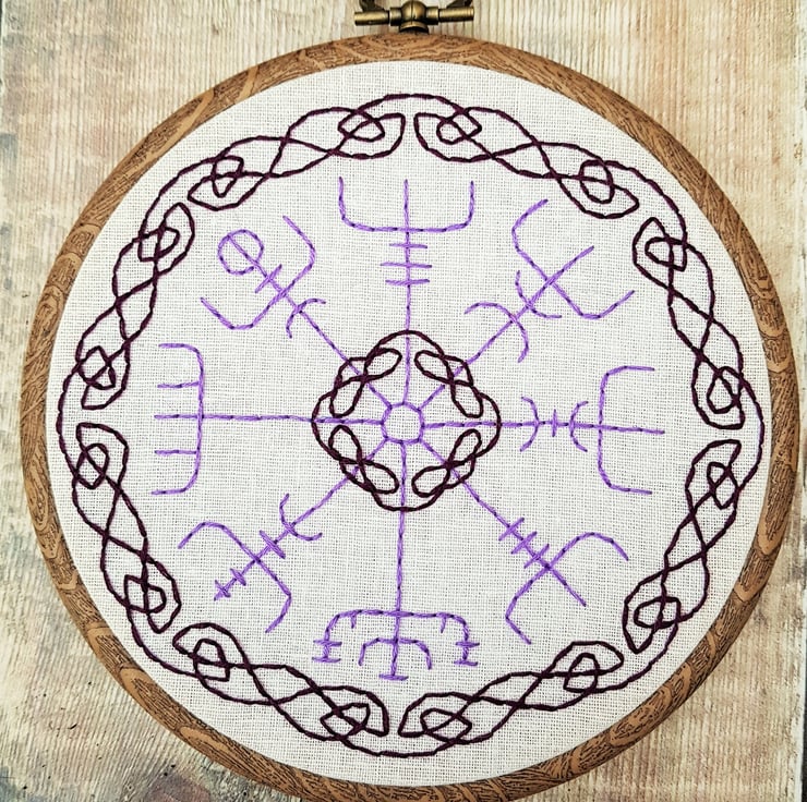Vegvisir, the Viking Compass is completely hand embroidered on to linen, and framed in a hoop.