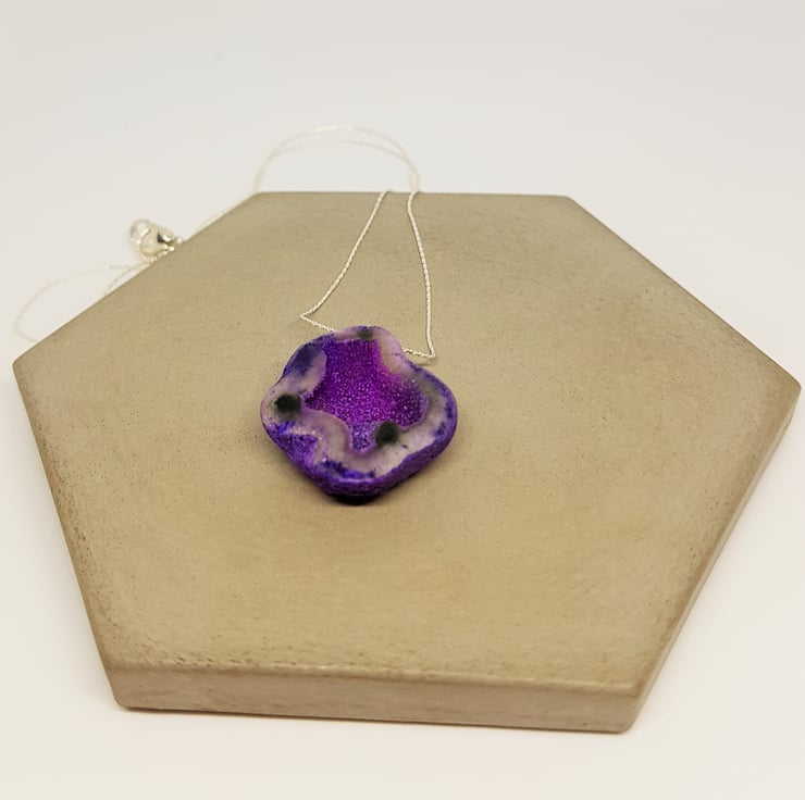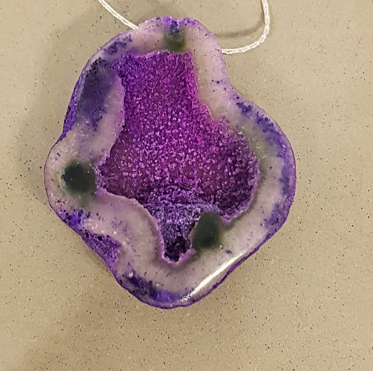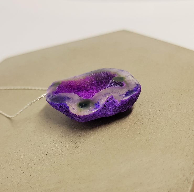 A beautiful purple Druzy cavern has been threaded on to sterling silver beading wire to form this necklace. The colours are stunning, and it has so much sparkle.