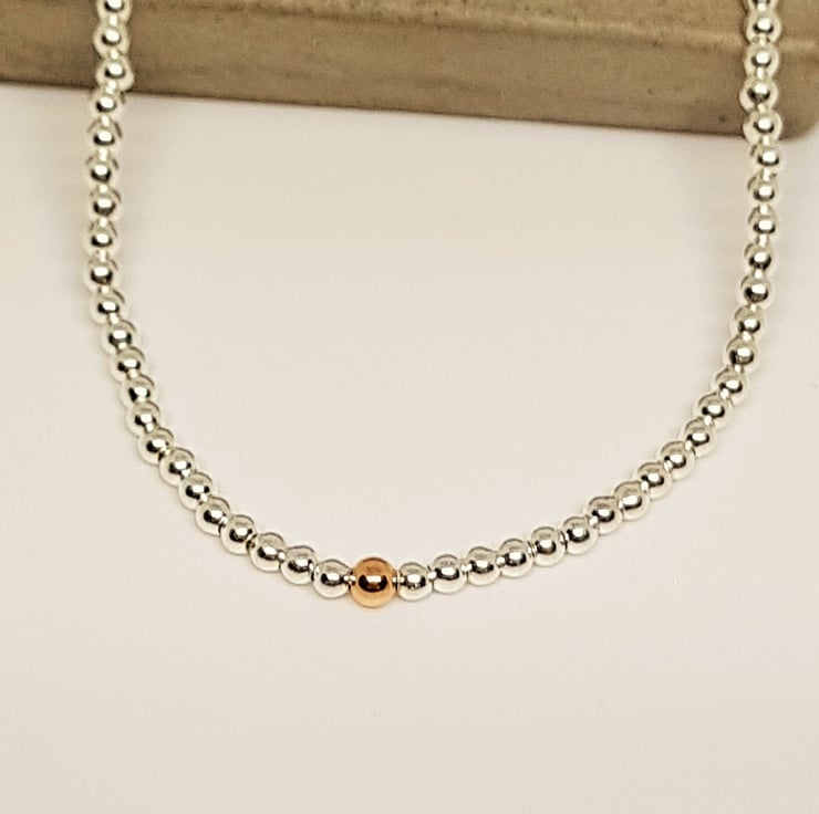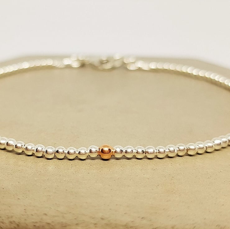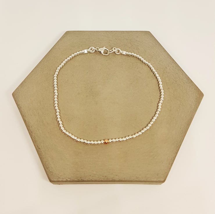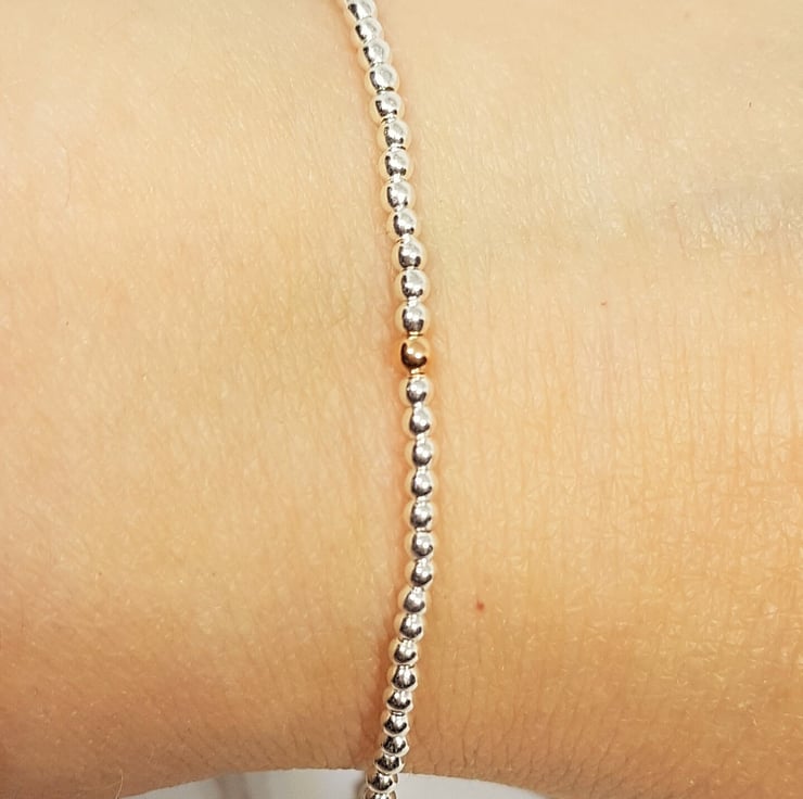 The bracelet has 2mm sterling silver beads, with a 2mm rose gold bead.