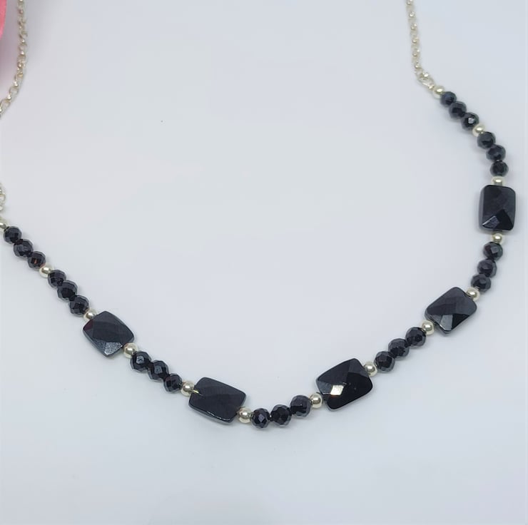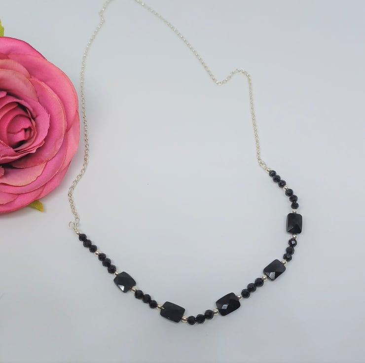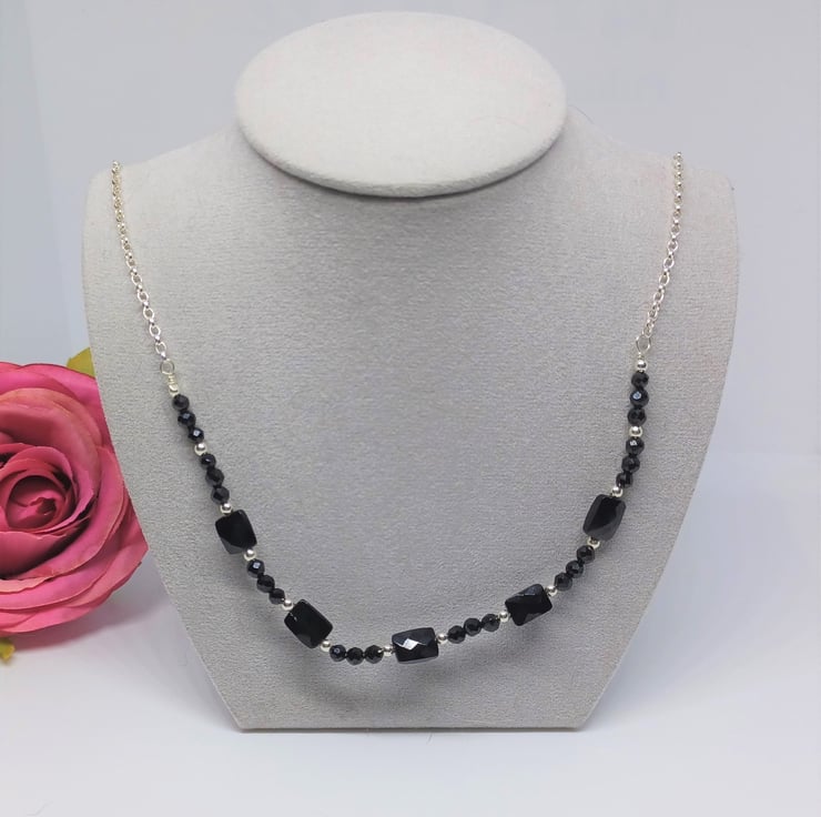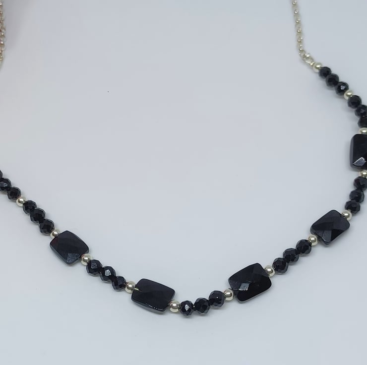 The necklace features Black Spinel faceted rectanglelozenges, interspersed with faceted black spinel coin shaped beads, and sterling silver beads. It is finished with sterling silver chain, to form this stunning necklace.
