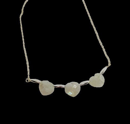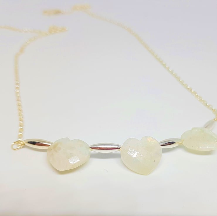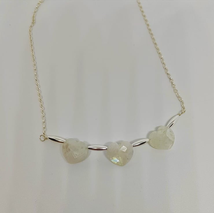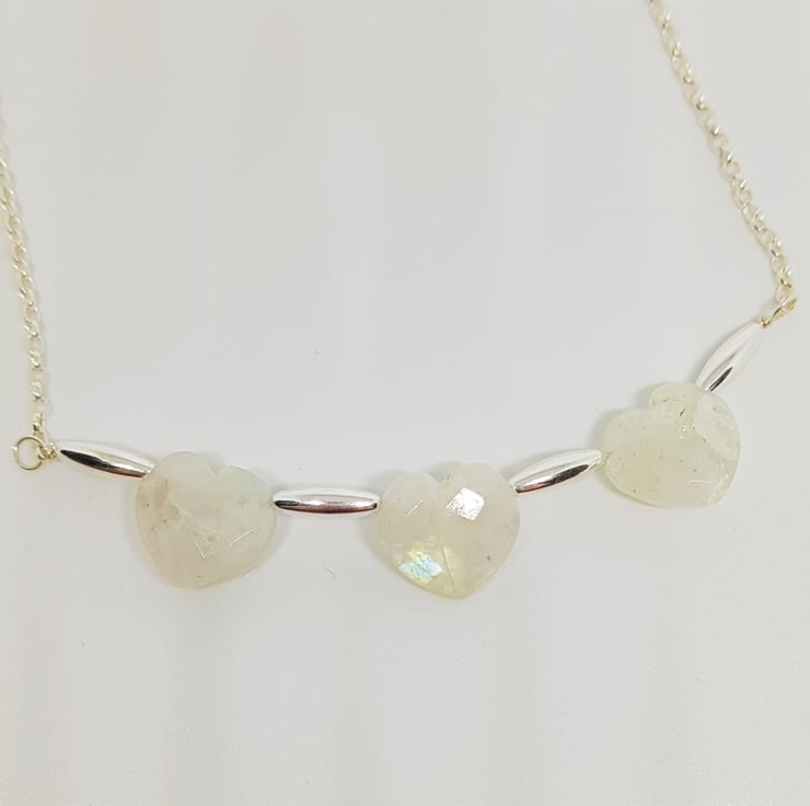The necklace features a trio of moonstone hearts, separated by sterling silver lozenges. The moonstone is SO hard to photograph - it actually has lovely little hints of colour that flash through.