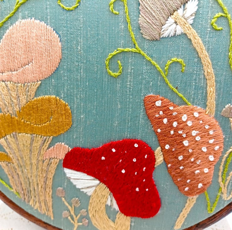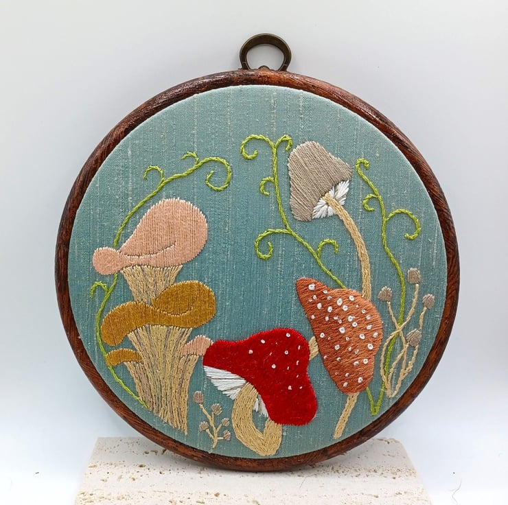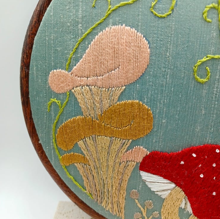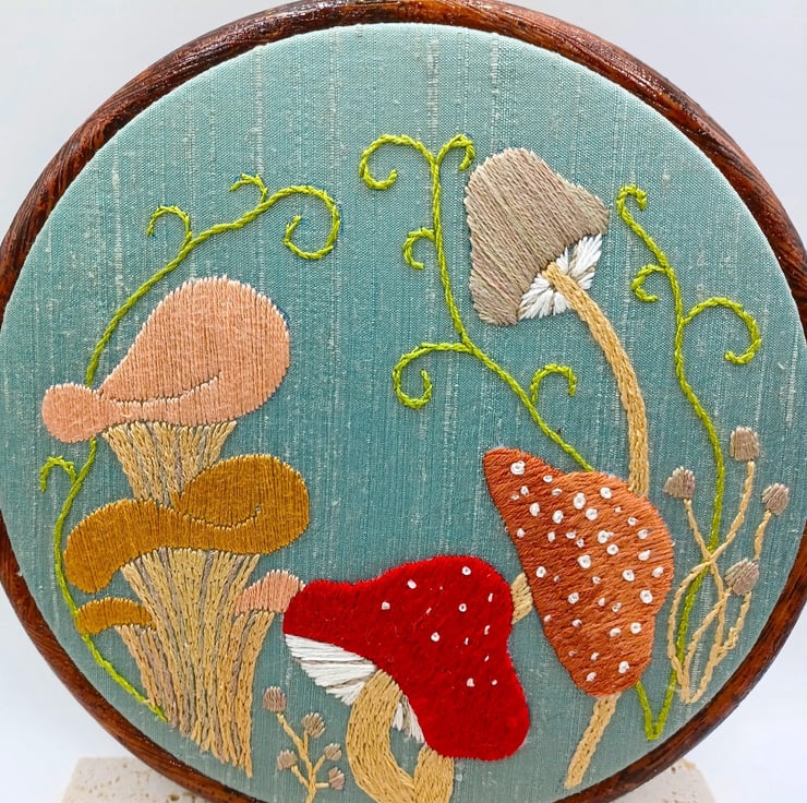 A multitude of different mushroomtoadstool designs hand stitched using silk threads on to a green silk base, this has lovely texture to the design. Framed in a 6 inch hoop.