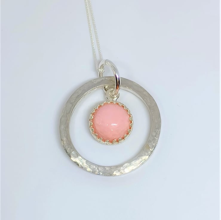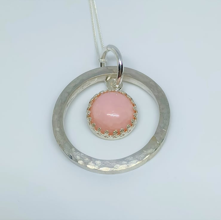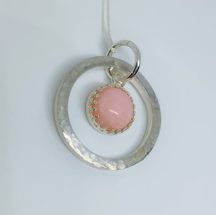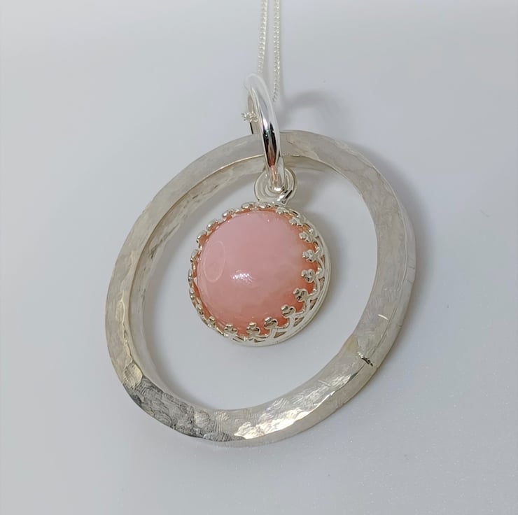 This pink opal cabochon is set into a sterling silver surround, and suspended in front of a hand textured, chunky sterling silver ring. Supplied on a sterling silver chain (styles may vary)