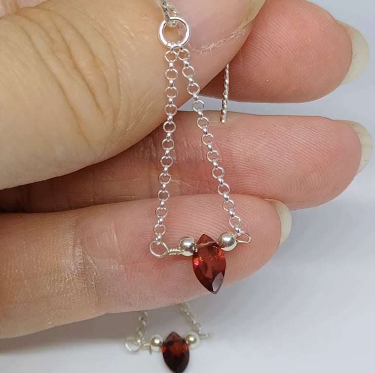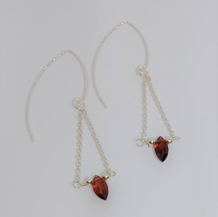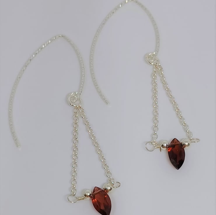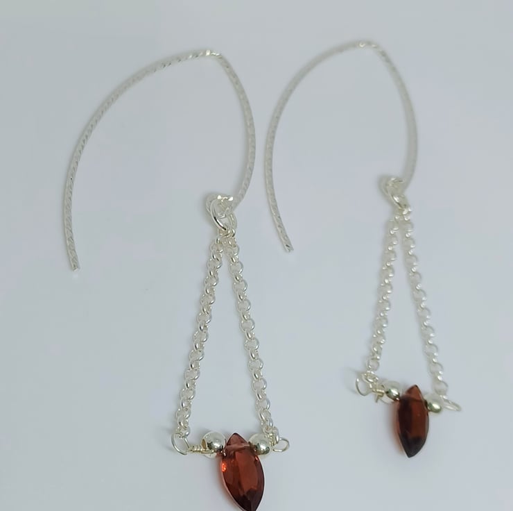 Faceted garnet drops are threaded on to sterling silver wire, and hang in between lengths of sterling silver chain. Suspended on shaped, sparkly silver earwires