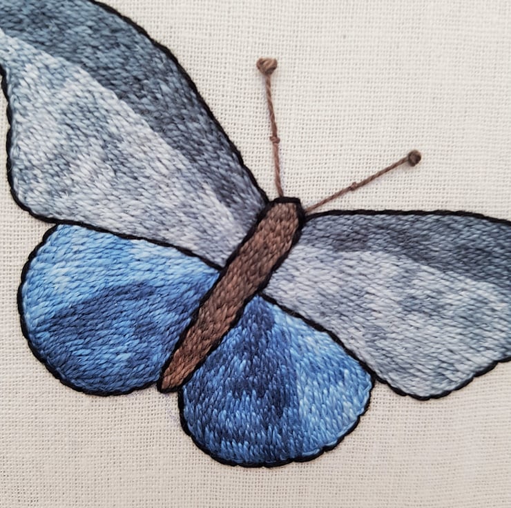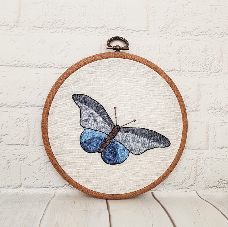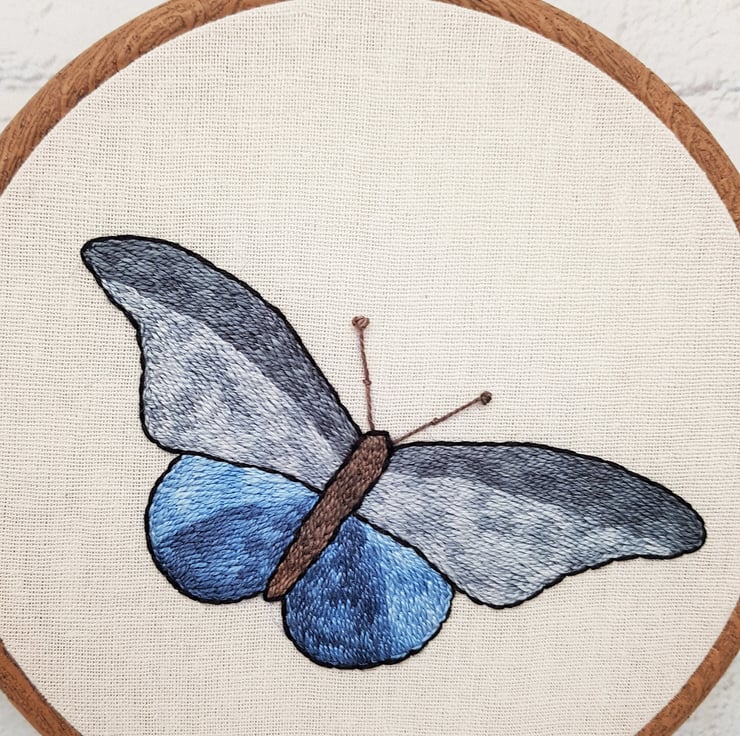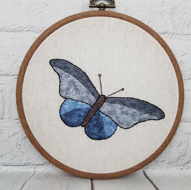 This pretty butterfly is hand embroidered on to linen, using hand dyed perle threads in different shades of blue which give the most beautiful texture.