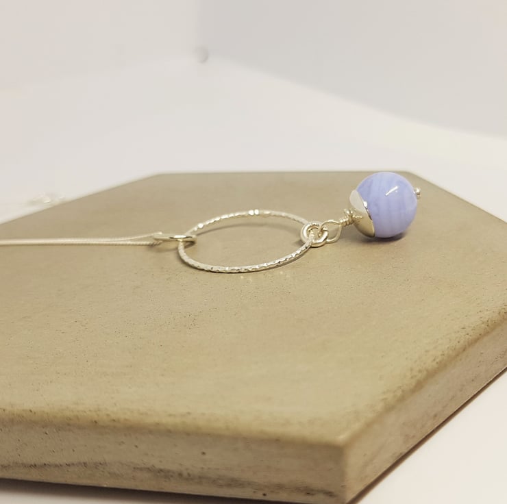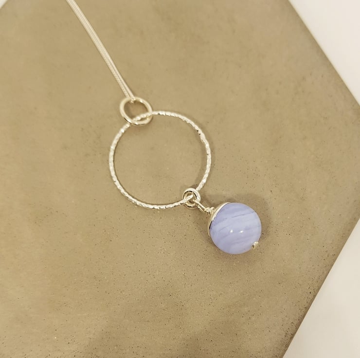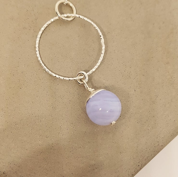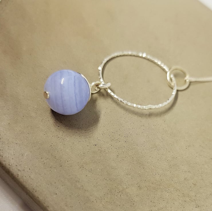 The pendant has the Agate suspended beneath a sterling silver textured ring.