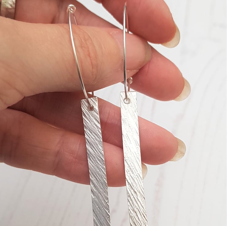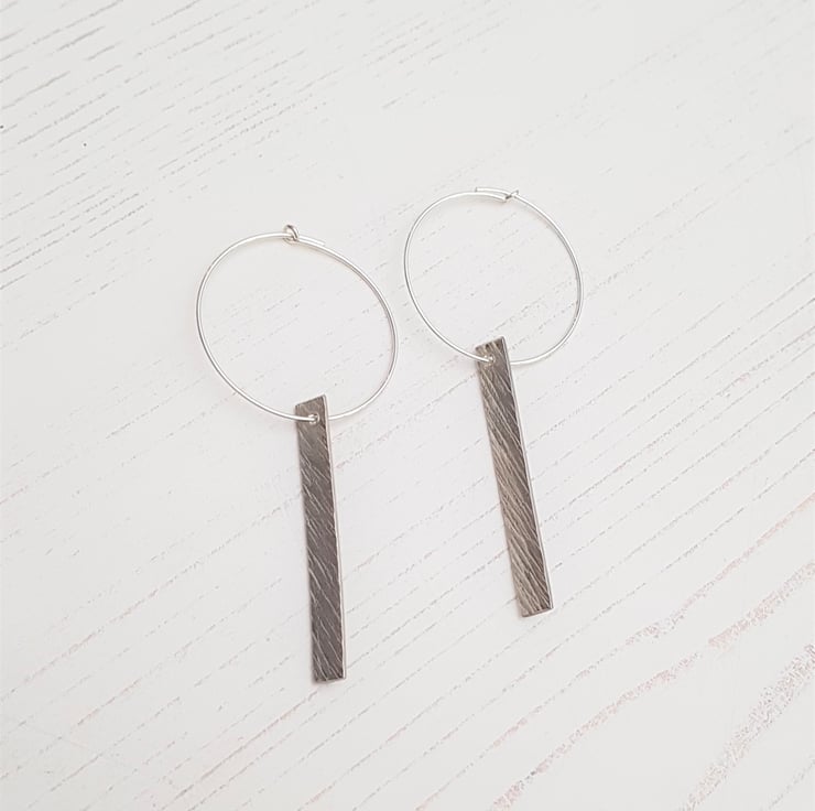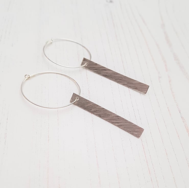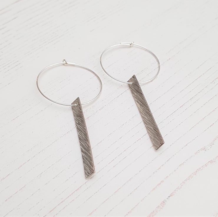 These earrings are a hammered lines texture bar suspended from a sterling silver hoop, The bar measures approximately 40mm, and the hoops are approximately 30mm