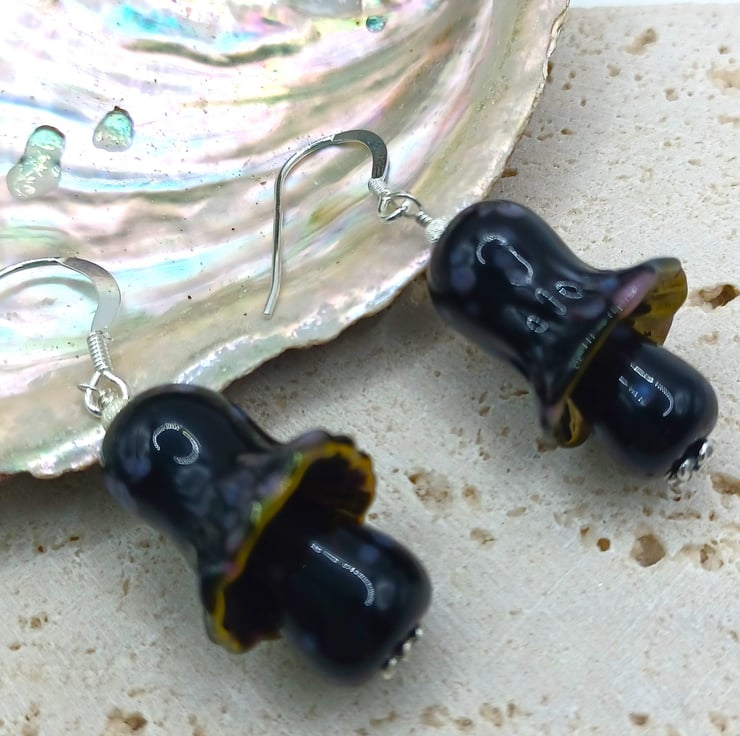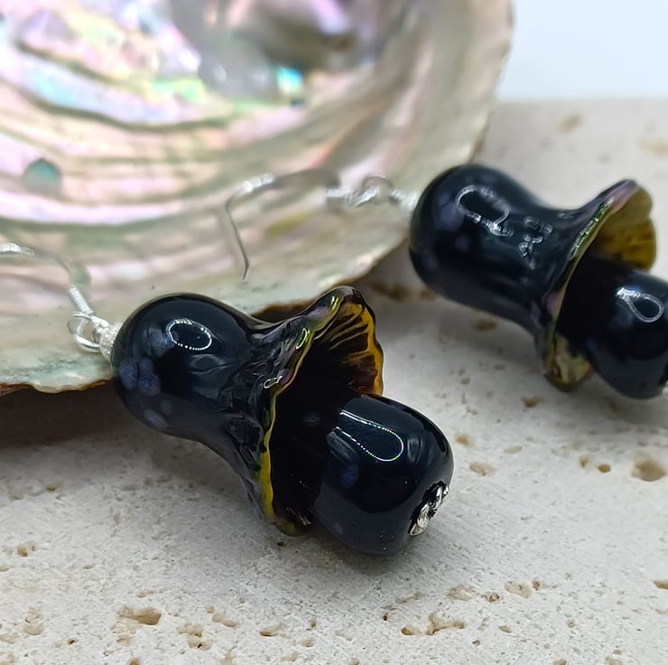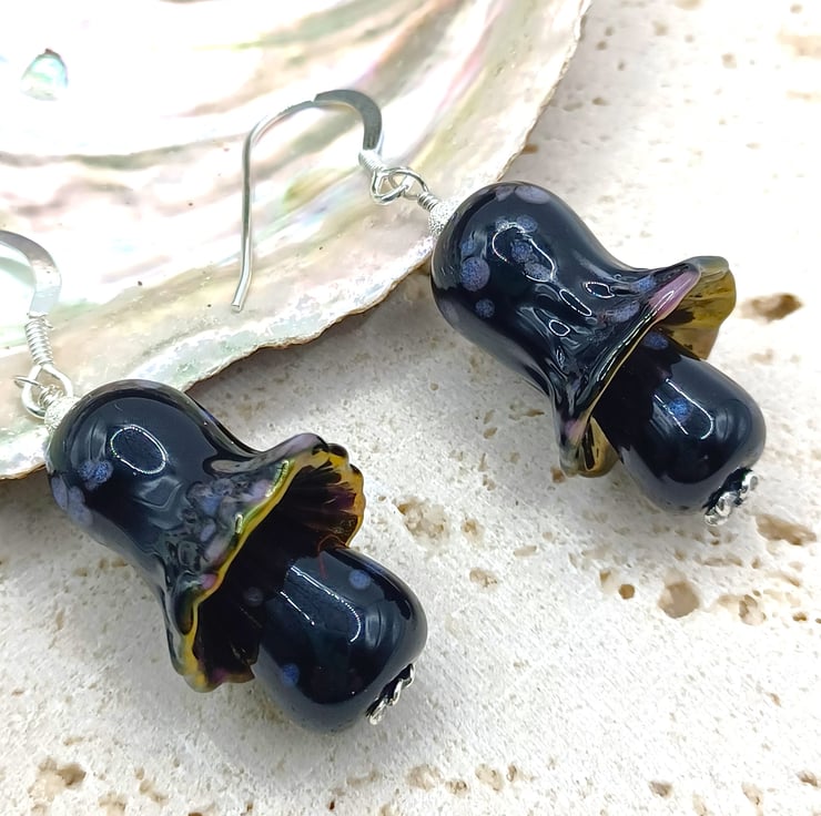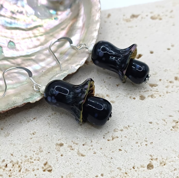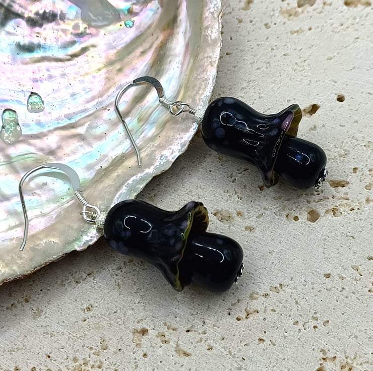 Mushroom Earrings, Toadstool Earrings, Lampwork Glass Mushrooms, Glass Toadstools, Sterling Silver Earrings, Black Mushrooms, Fungi Gift