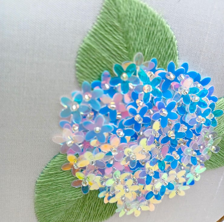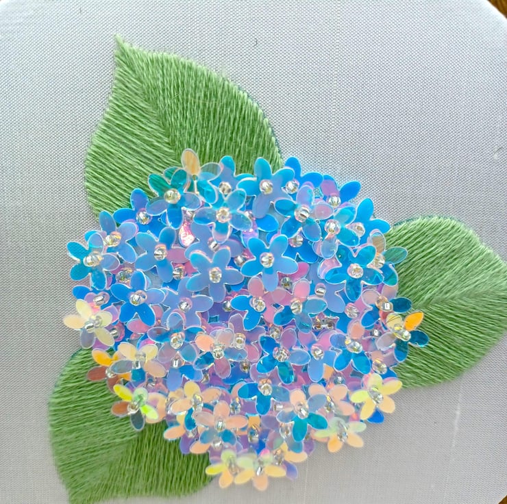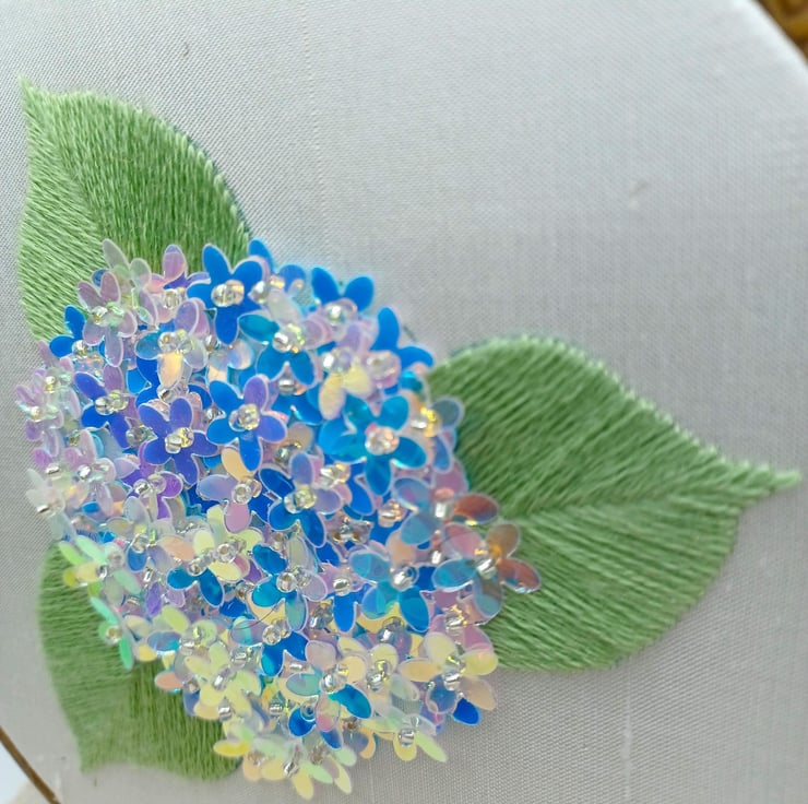 The Hydrangea has traditional thread embroidery leaves, with the flowers made up of different shades of floral sequins this was so hard to photograph!