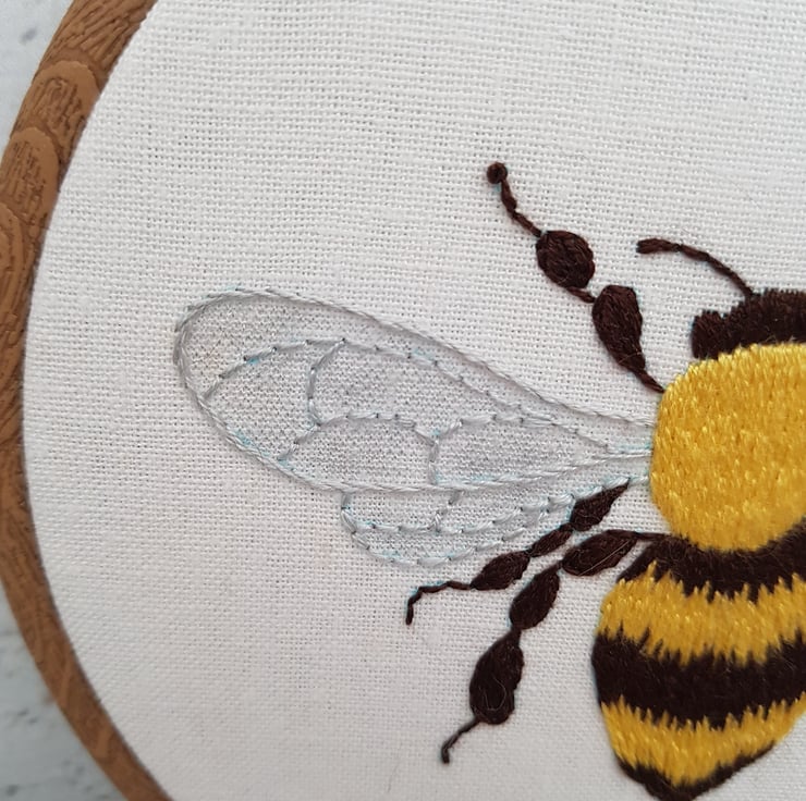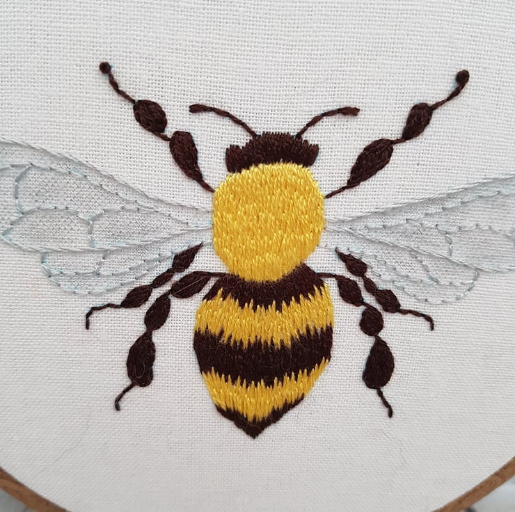 This stunning bee is completely hand embroidered using silk threads, on to high quality linen, and finished off with a felt circle at the back of the frame to cover all the stitches and protect the hoop while hanging.