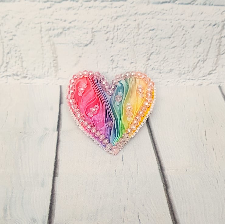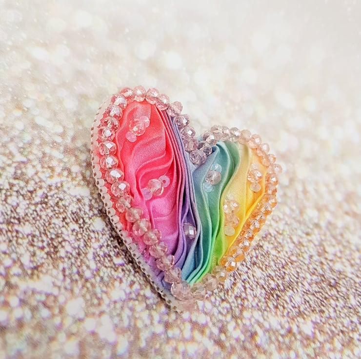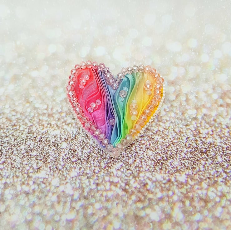 Rainbow Heart Brooch, Shibori Ribbon Brooch, Beaded Heart Brooch, LGBTQIA Brooch, Pride Brooch, Heart Pin, Beaded Pin, Rainbow Jewellery