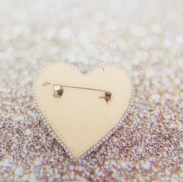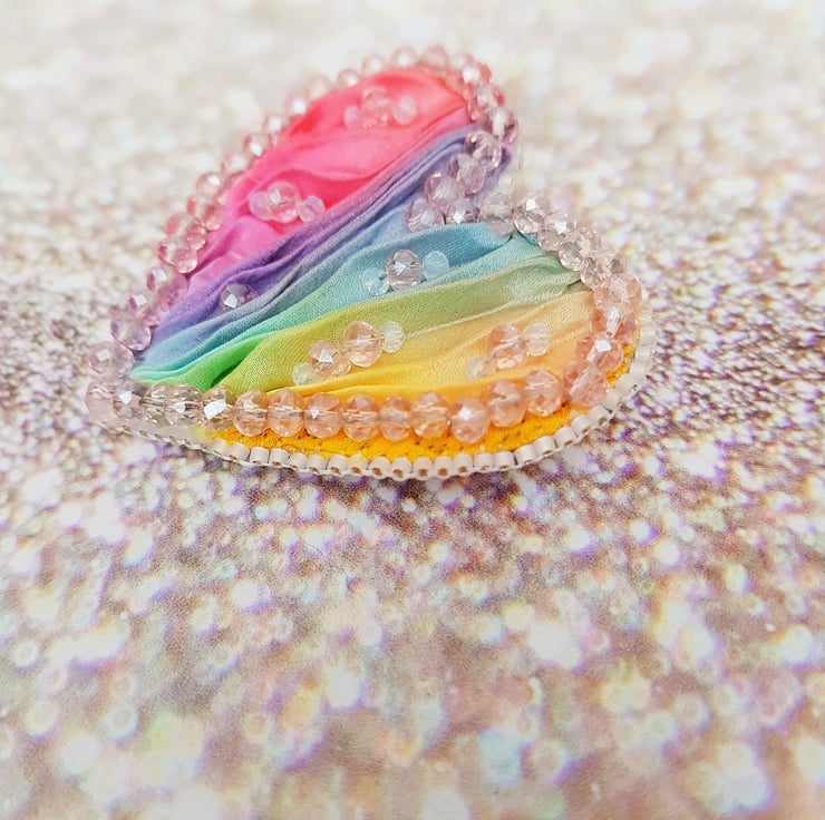 This rainbow heart brooch has been completely hand stitched using a gorgeous pastel rainbow coloured Shibori ribbon, and has been accented with beads and crystals. It has been backed with a soft suede so that it sits nicely, and does not catch on clothing. The edges have been hand beaded to finish.