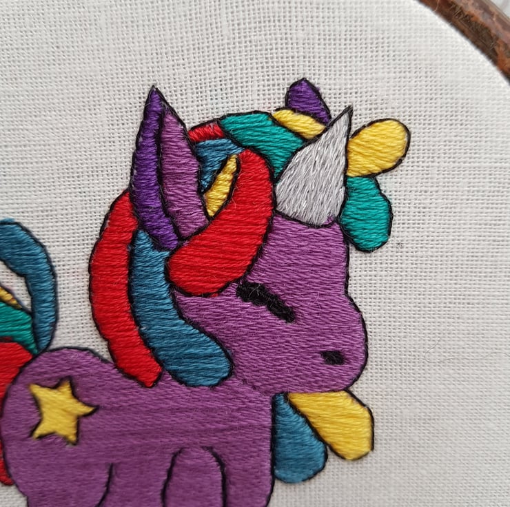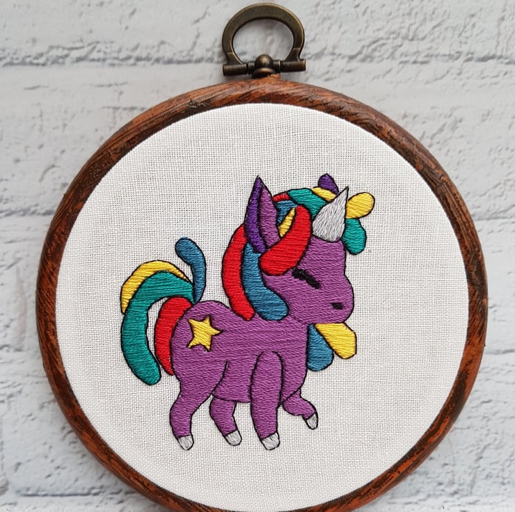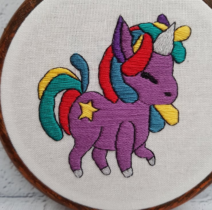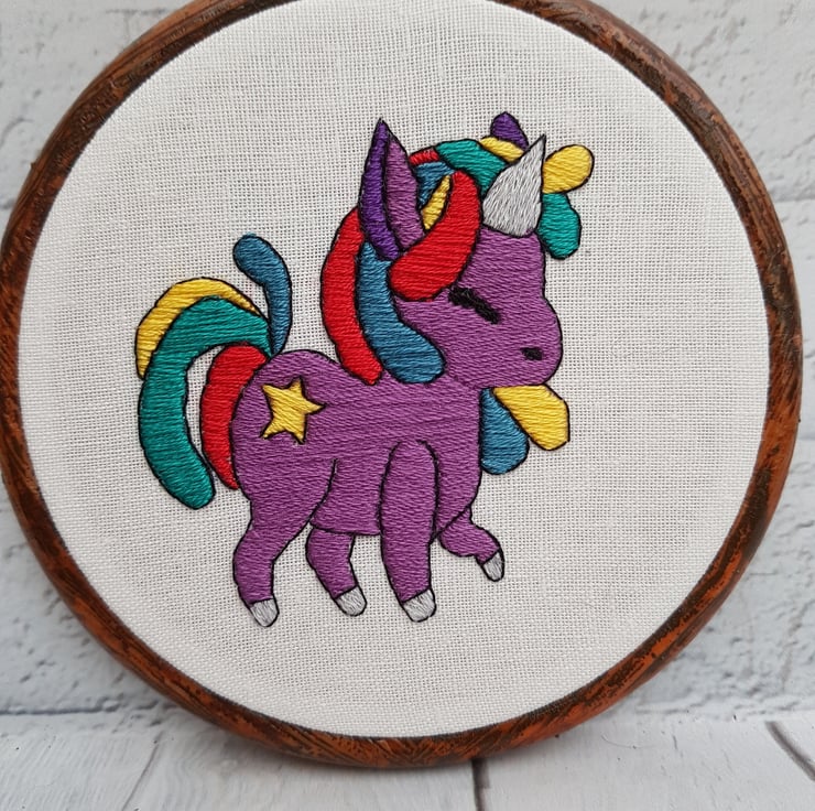 Bring a touch of magic and whimsy to your space with this hand embroidered rainbow unicorn hoop! Meticulously crafted with vibrant colours and intricate details, this charming piece of art is perfect for any unicorn lover. Whether you're decorating a nursery, adding a splash of colour to your living room, or searching for a unique gift, this hoop is sure to delight.