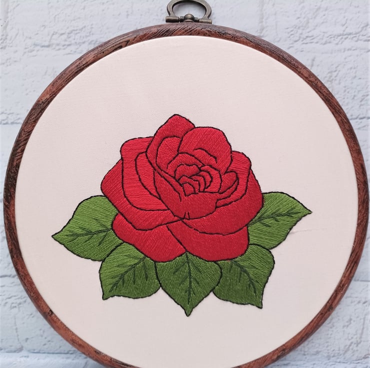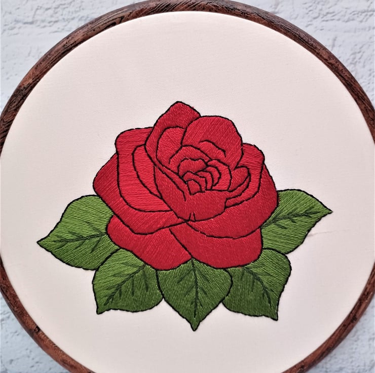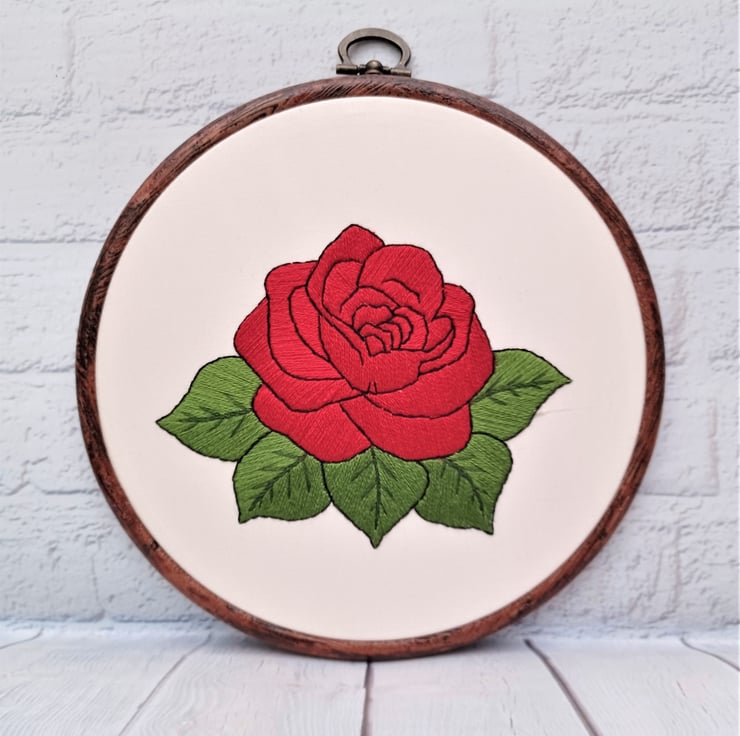Adorn your space with the timeless beauty of my hand embroidered red rose hoop art. This exquisite piece is meticulously crafted using luxurious silk threads on a delicate ivory silk base, framed elegantly in a 6-inch hoop. Perfect for adding a touch of elegance and sophistication to any room.
