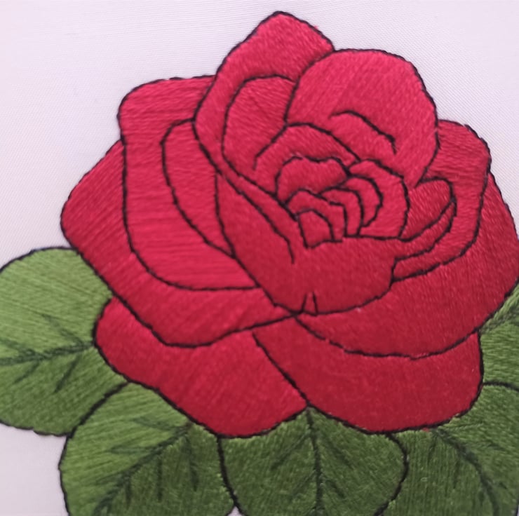 Detailed Craftsmanship: The red rose is hand embroidered with precision, showcasing intricate detailing and lifelike texture.