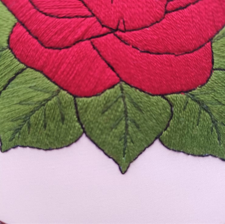 This hand embroidered red rose hoop art is more than just a decoration; it's a piece of art that brings beauty and sophistication to your space. The combination of silk threads and silk base creates a luxurious texture and vibrant colours that will catch everyone's eye.