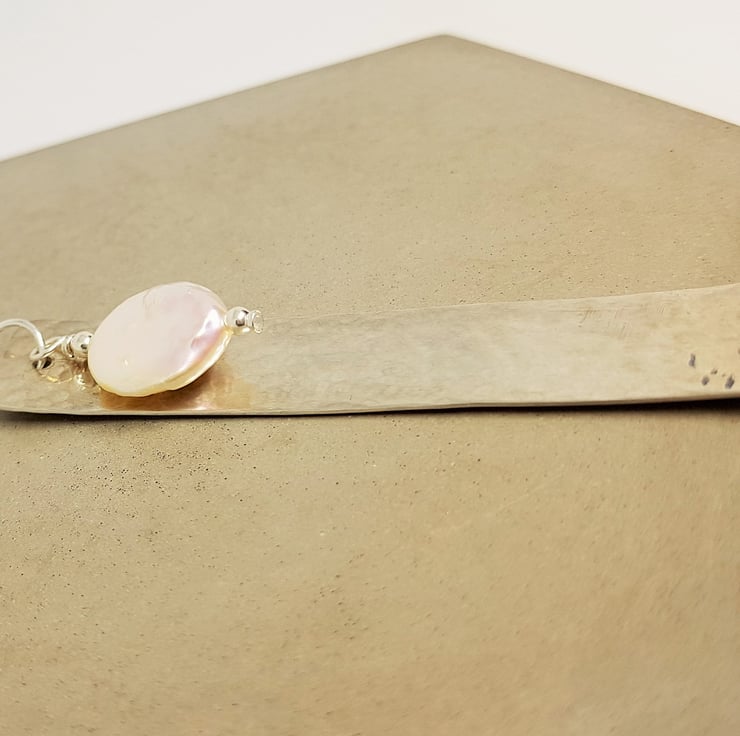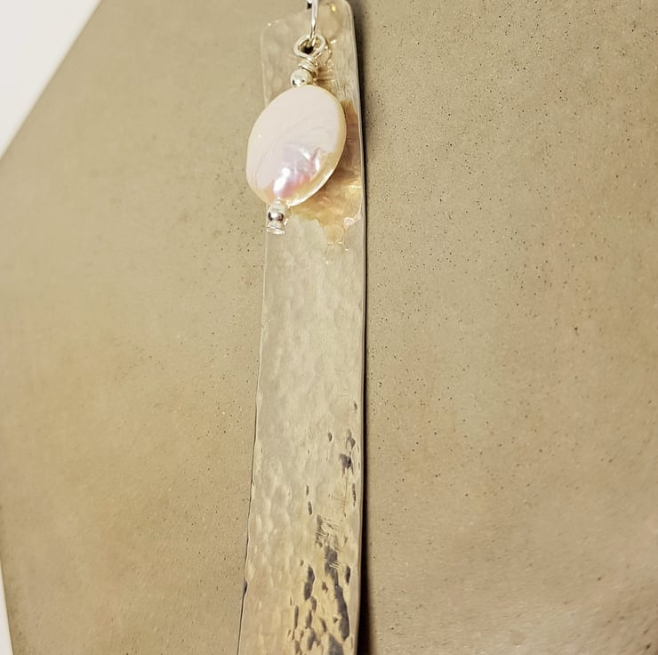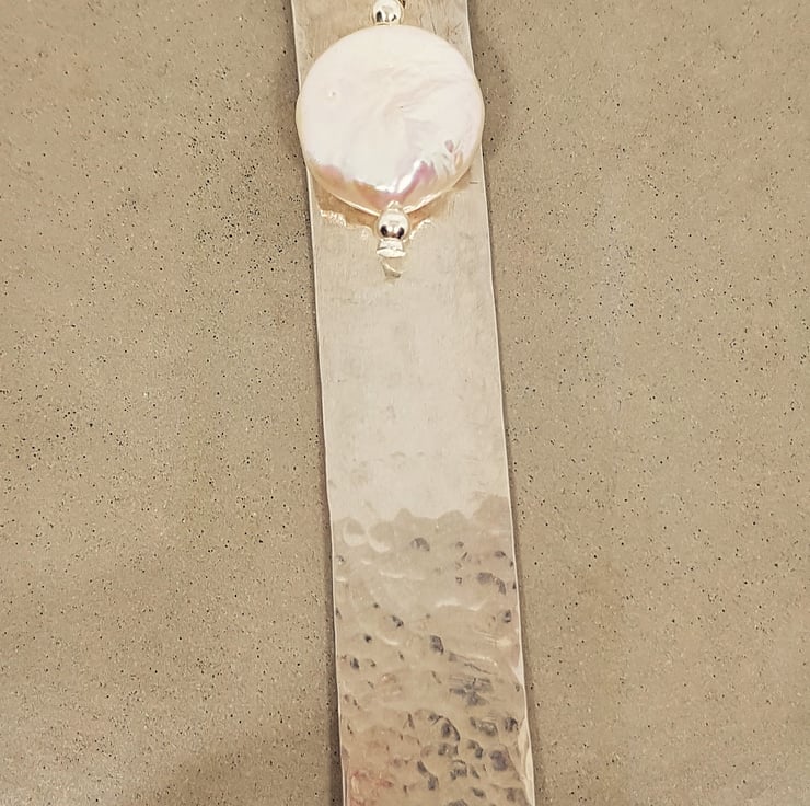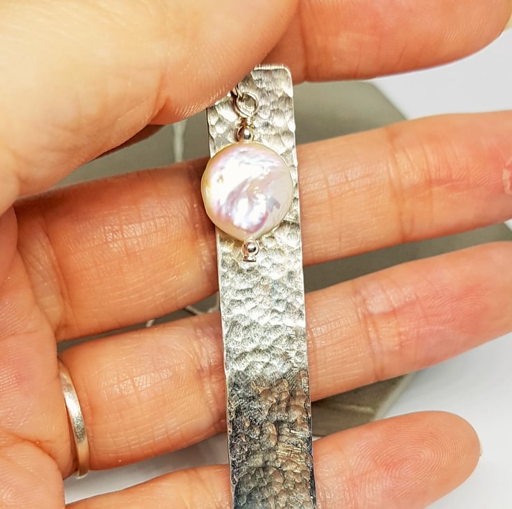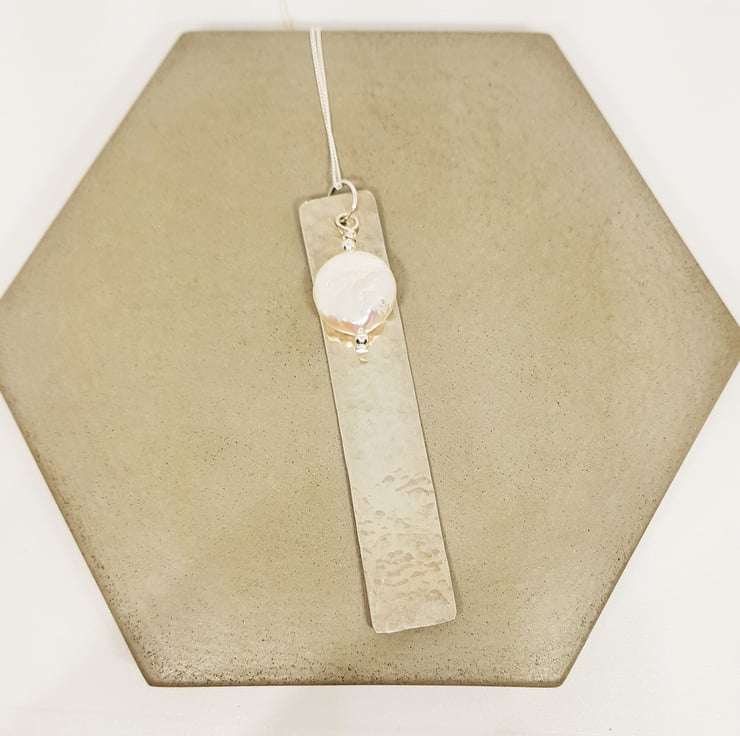 This pendant features a coin shaped pearl suspended in front of a hand textured sterling silver bar. The silver bar measures approximately 6cm long.
