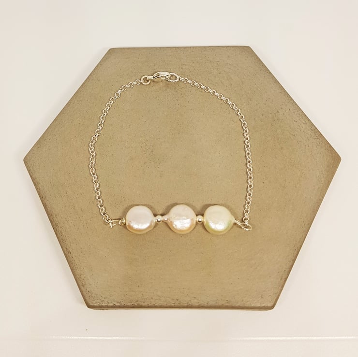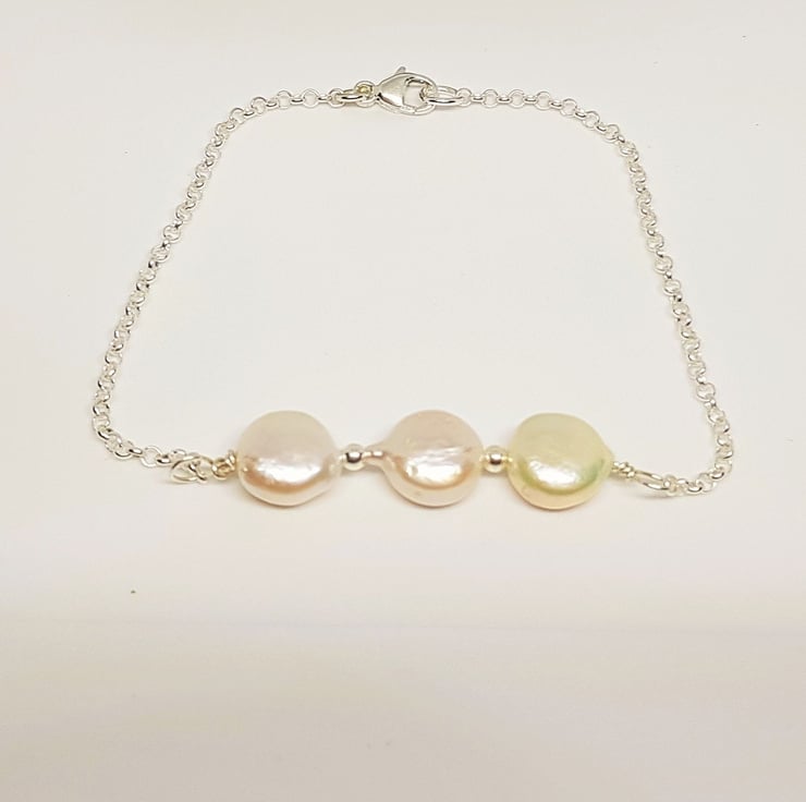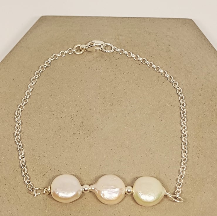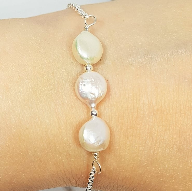 Elegant Sterling Silver Bracelet with Three White Coin Pearls, 925 Silver Bracelet, June Birthstone Gift, Trio Pearl Gift, Bridesmaid Gift