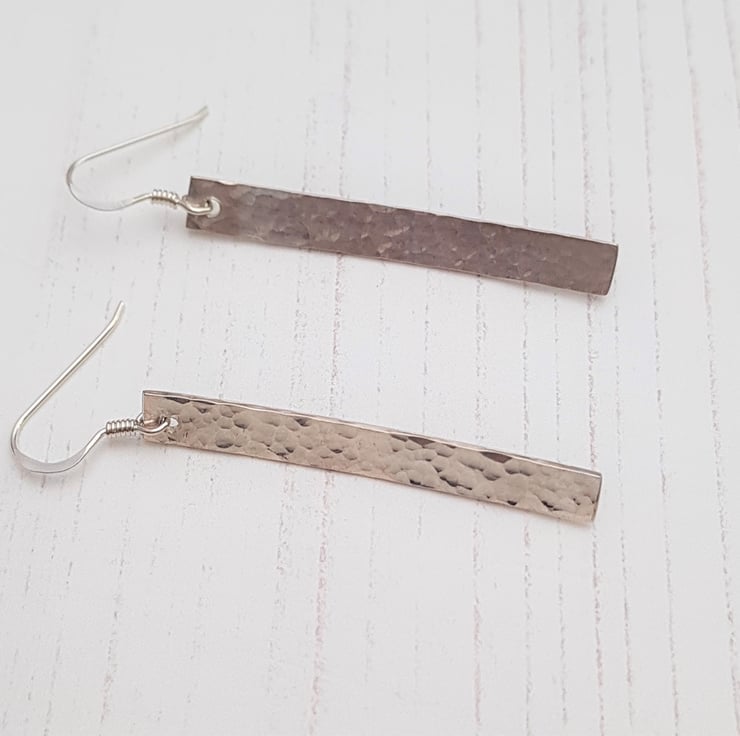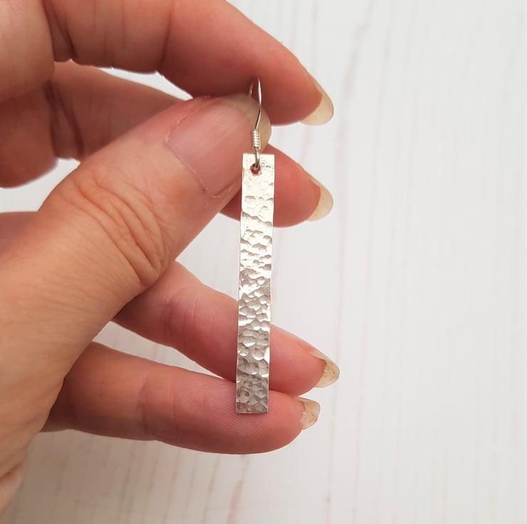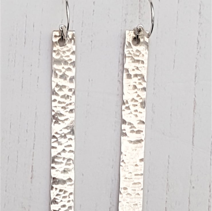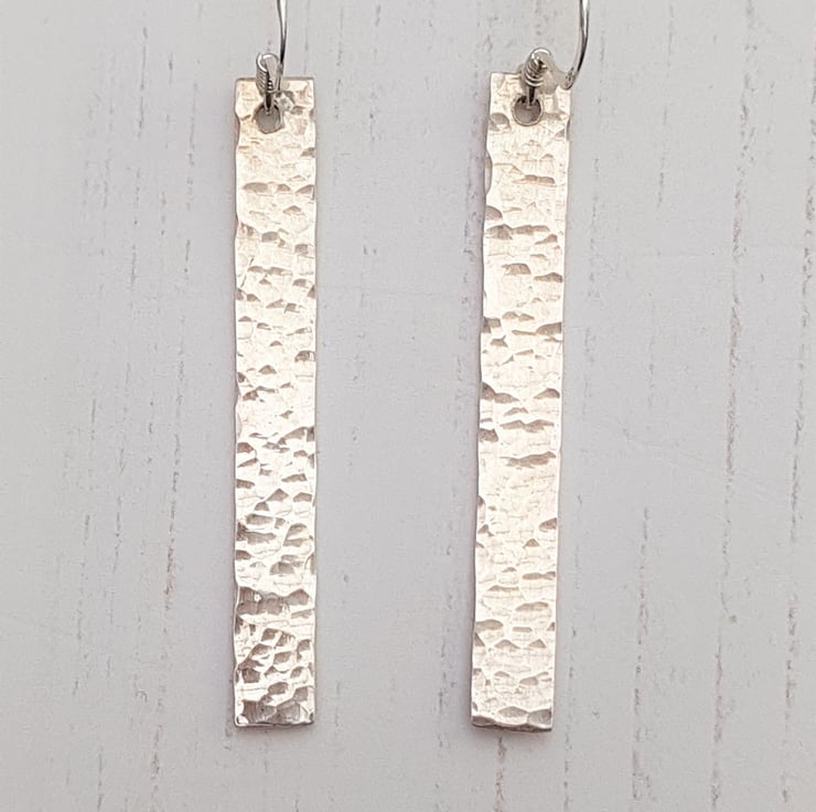 These earrings are a hammered texture bar on a sterling silver earwire. The entire earring (including earwire) measures approximately 60mm