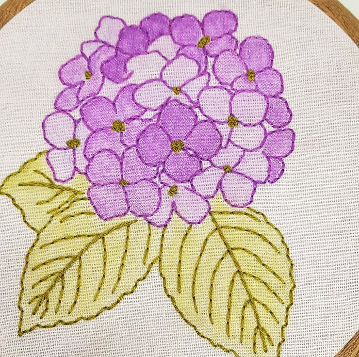 Hydrangeas were my dads favourite, so I really enjoyed stitching this. I added colour direct to the linen to add depth, and added a little sparkle too! It's so hard to photograph though!