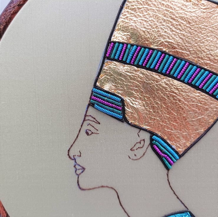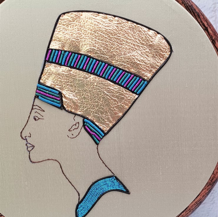 My homage to Nefertiti is completely hand stitched with a combination of traditional embroidery using silk thread, and goldwork embroidery using a variety of goldwork metals, and leather. All on a pale green silk backing, and framed in a six inch hoop.