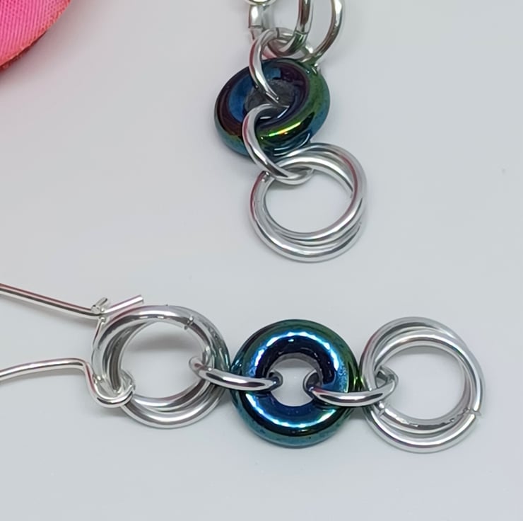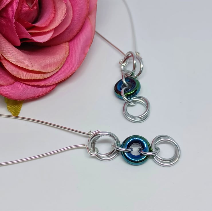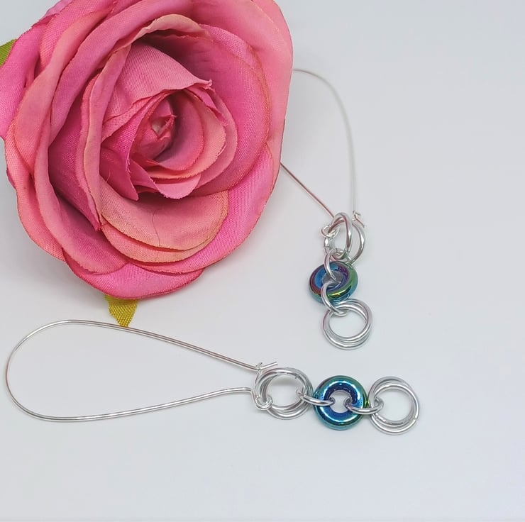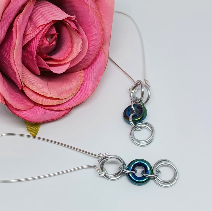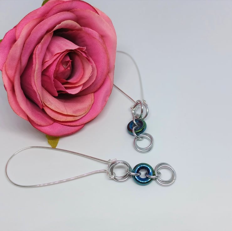 Silver coloured chainmaille mobius roses are interspersed with bluegreen Czech glass donut rings to create these statement earrings. They are finished with fabulous long kidney style earwires, which are sterling silver.