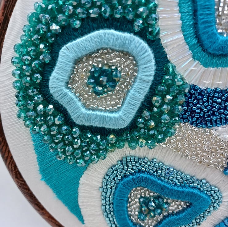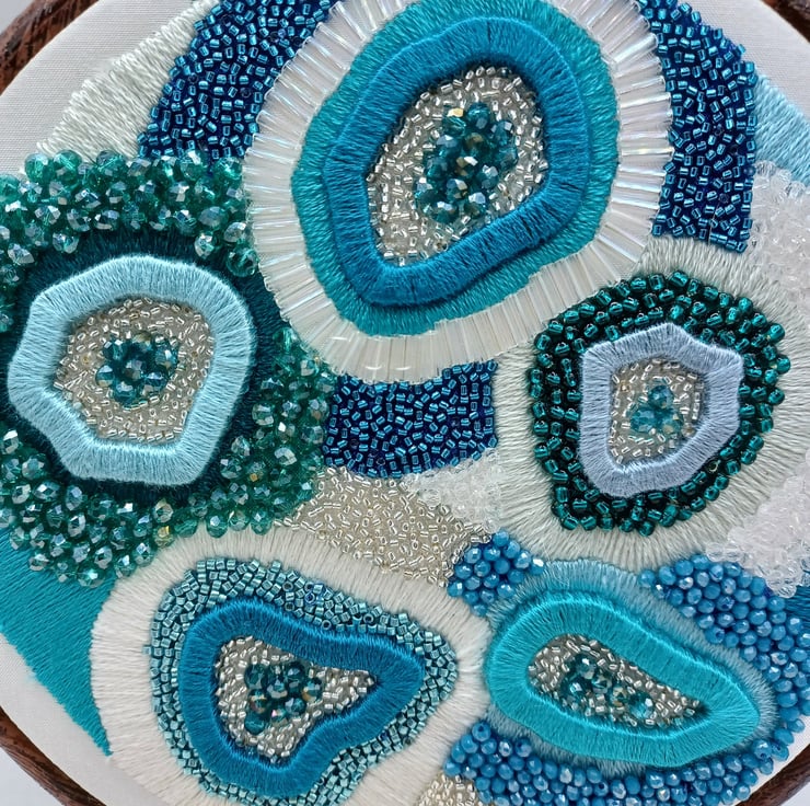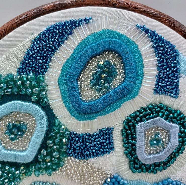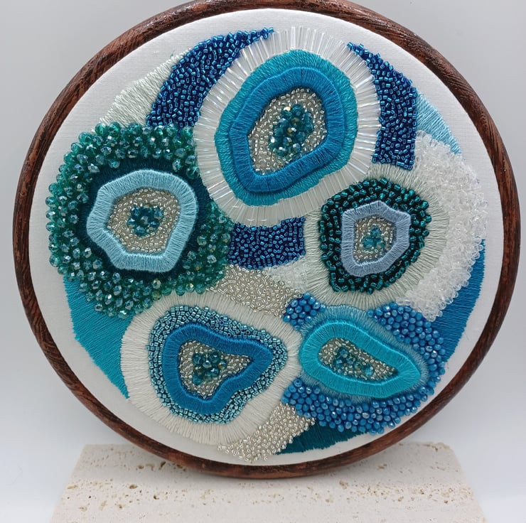 Hand Embroidered & Beaded Geode Art in 6" Hoop, Unique Crystal Wall Decor, Geode Gift for Nature Lover, Embroidery Wall Art, Blue Crystal