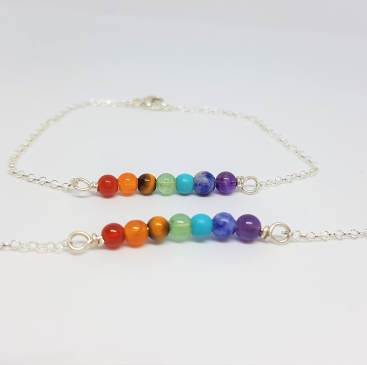 This Chakra set features 4mm round gemstone beads, on sterling silver. This bar style bracelet fastens with a lobster claw clasp, and measures approximately 7.5 inches.