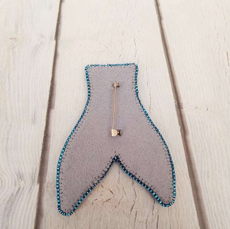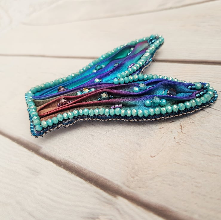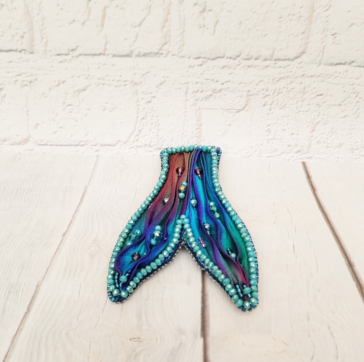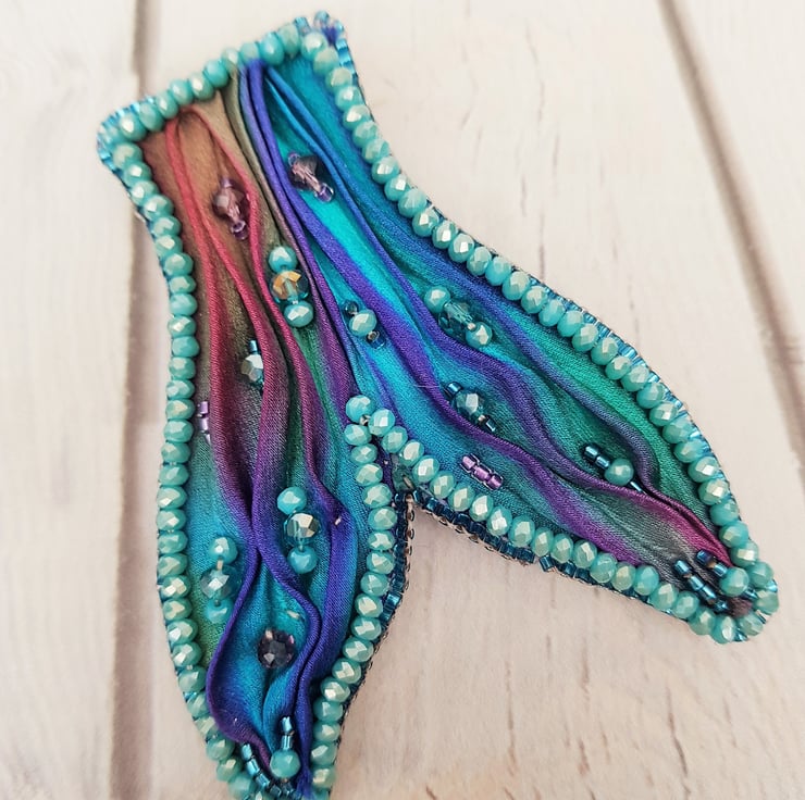 This beautiful mermaid tail brooch has been completely hand stitched using a gorgeous Shibori ribbon, in shades of blue, teal and purple, and has been accented with beads and crystals. It has been backed with a soft suede so that it sits nicely, and does not catch on clothing. The edges have been hand beaded to finish.