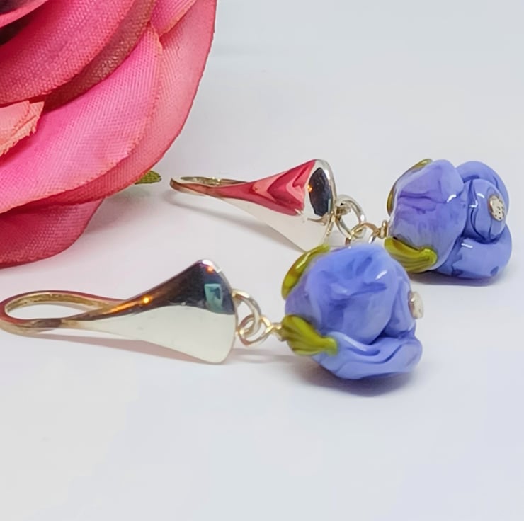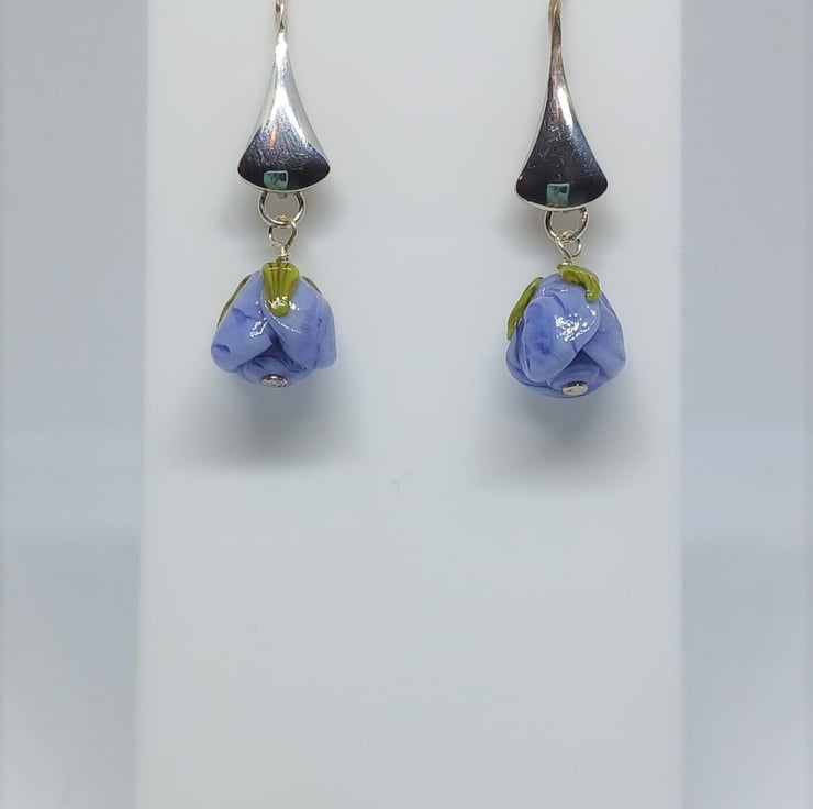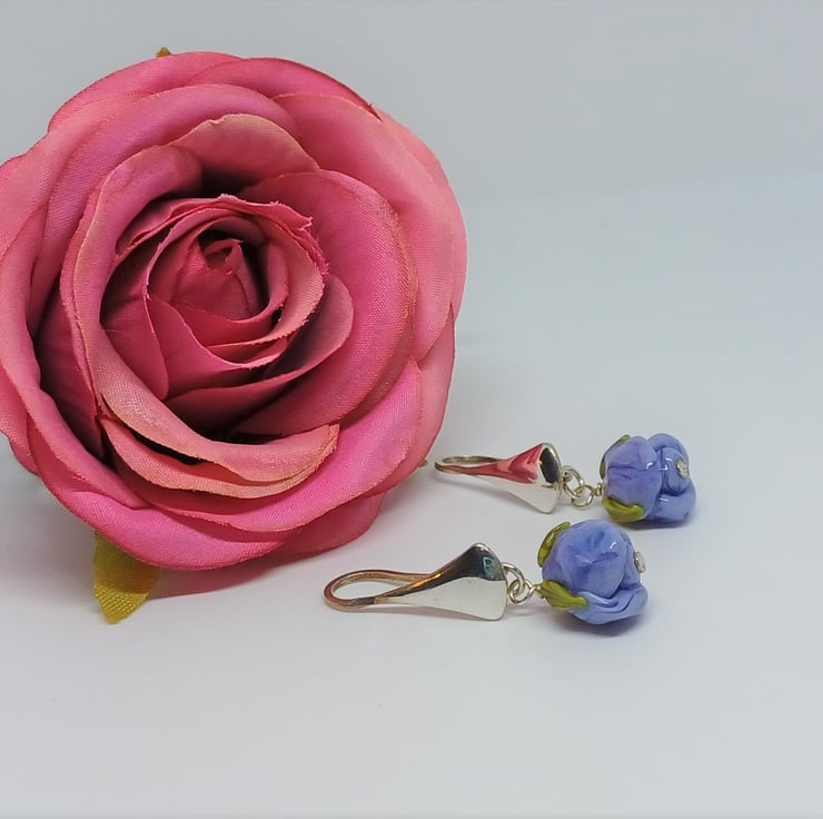 The lampwork rosebuds are a beautiful shade of purpleblue. They feature sterling silver earwires with teardrops just above the rosebud..