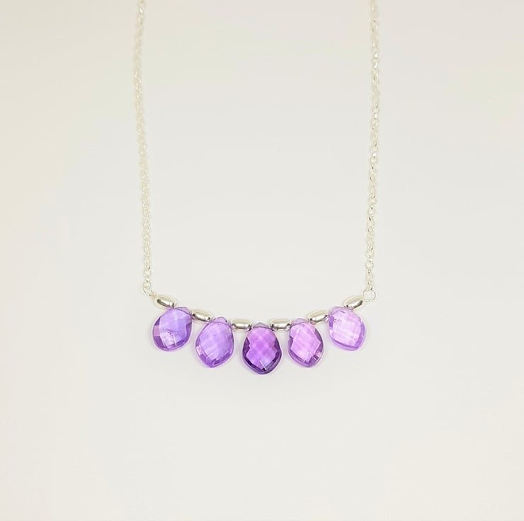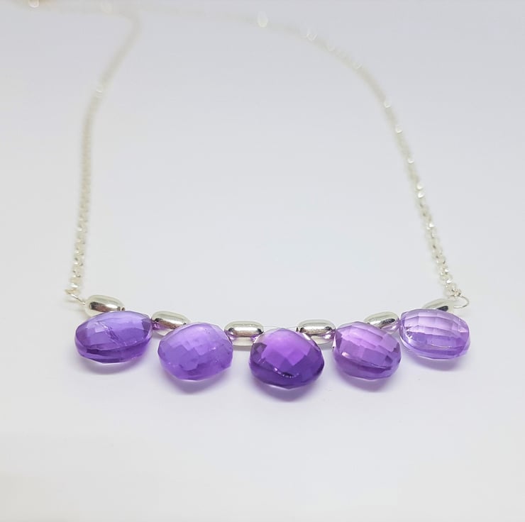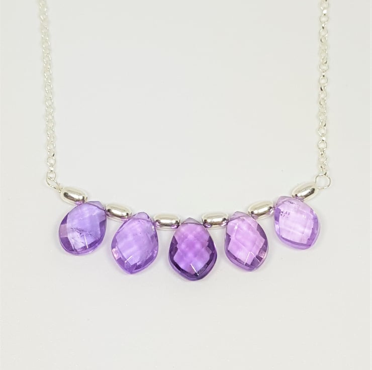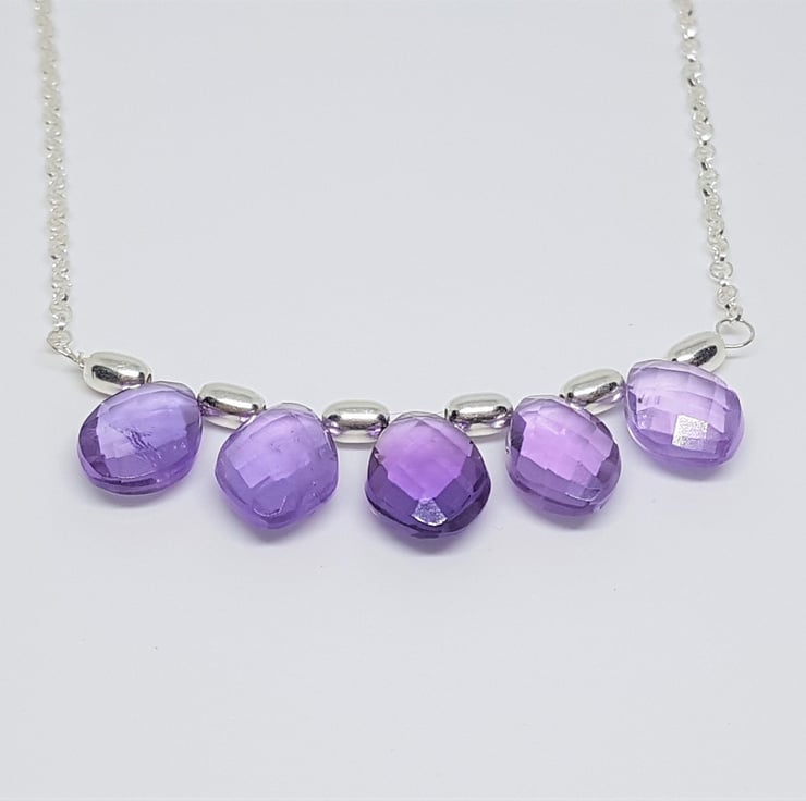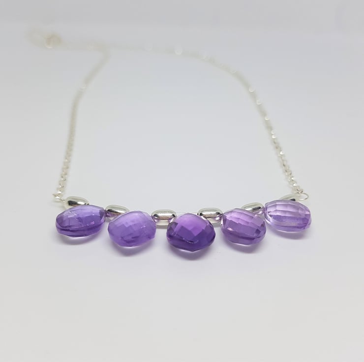 Five faceted amethyst drops are interspersed with sterling silver oval beads. Finished with sections of sterling silver chain, which fasten with a lobster claw catch. Total length approximately 18 inches.