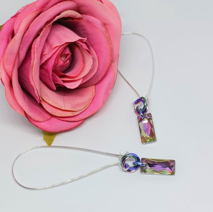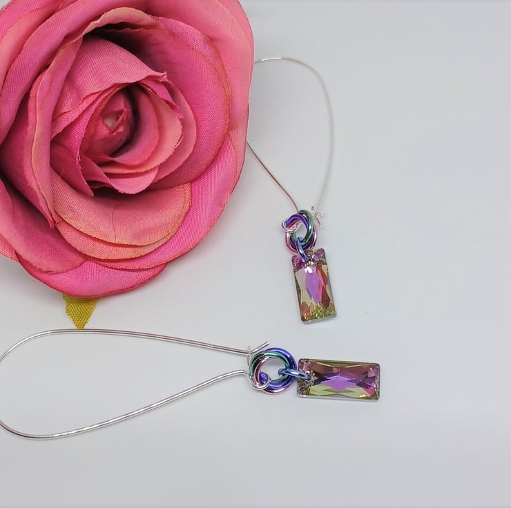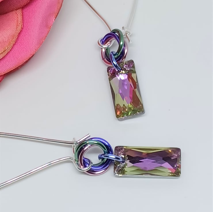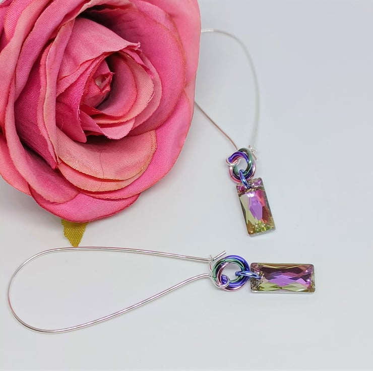 Pastel or Unicorn Coloured Mobius Rose with Crystal Drop Chainmaille Sterling Silver Earrings