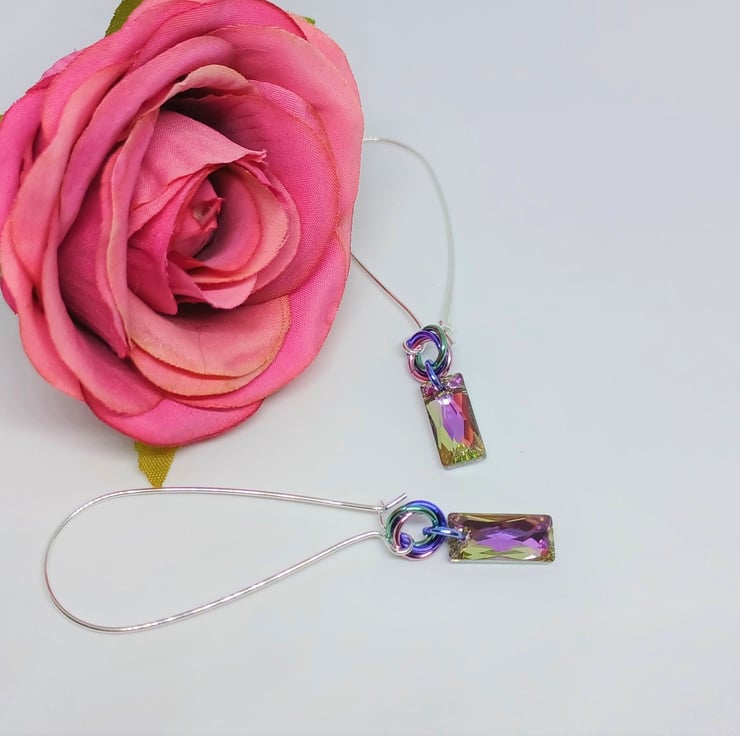 These fabulous earrings feature pastel or unicorn mobius roses, with a matching rectangular crystal drop.