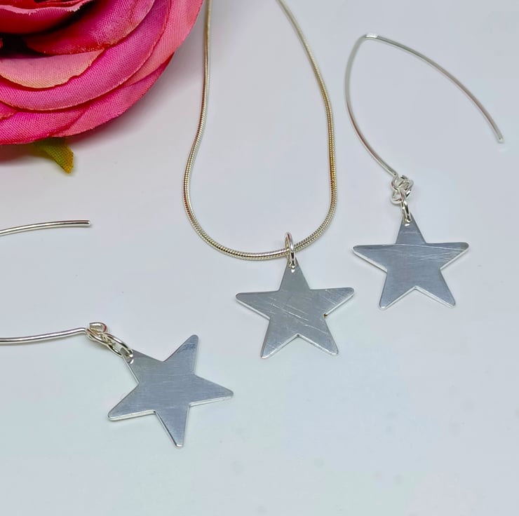 This set consists of a sterling silver star pendant, and earrings. The stars measure approx. 15mm, and have been given a lovely satin finish. The pendant is supplied on a sterling silver chain (style may vary)