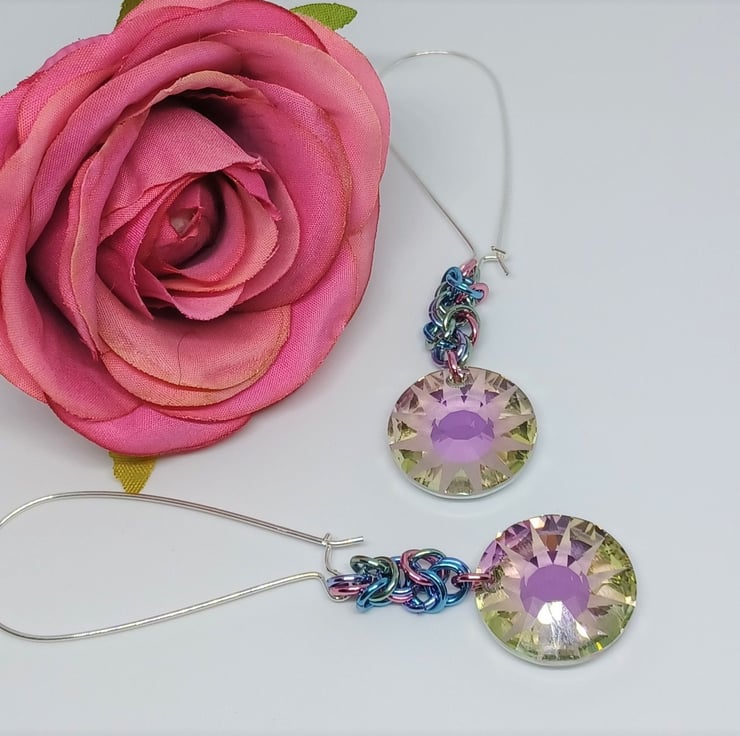 Pastel Unicorn Byzantine Chainmaille Long Sterling Silver Earrings with Round Crystal Drop