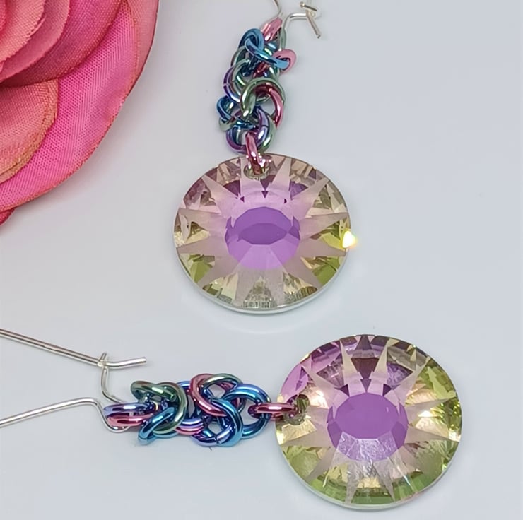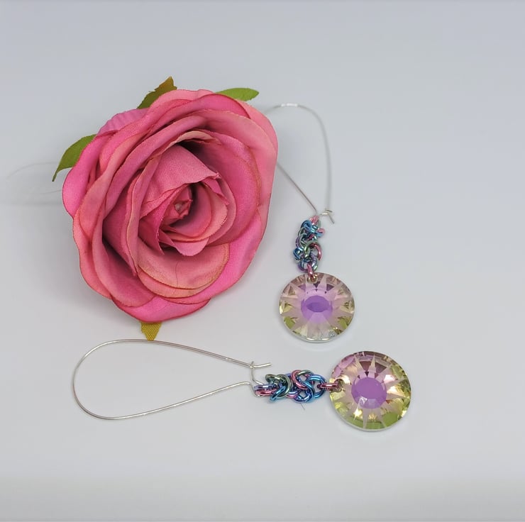 These fabulous earrings feature pastelunicorn shades of Byzantine weave, with a matching round crystal drop.