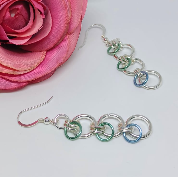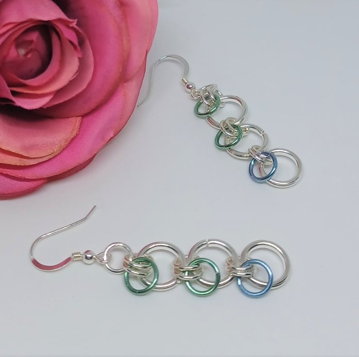 Silver, blue and green coloured chainmaille rings are used to create these statement, long earrings.